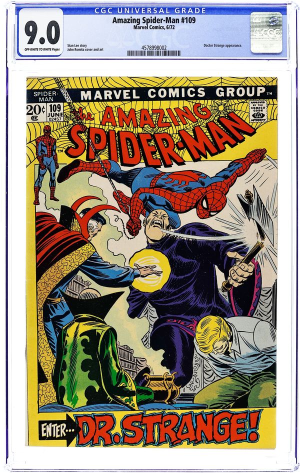 "Enter: Dr. Strange!" Part 2 of 2. Guest-starring Doctor Strange. Script by Stan Lee. Pencils by John Romita. Inks by John Romita and Tony Mortellaro (backgrounds). Cover by John Romita. The web-slinger frantically swings through the city trying to pick up a signal from his spider tracer! The amazing one tossed the tracer on the tall man who abducted Flash last issue. So, find the tracer...find Flash! But instead, Spider-Man picks up a message from the Master of the Mystic Arts! Somehow Dr. Strange knows were Flash has been taken. The duo rushes to the location, and the battle to rescue Flash begins! Cameo appearances by Gwen Stacy, Harry Osborn, Aunt May, and Sha Shan. (Notes: Spider-Man and Dr. Strange meet again in Marvel Team-Up #21. This story was reprinted in Marvel Tales #88.) 36 pages. Cover price $0.20. Grade: CGC 9.0 explanation of grade Condition: Used (collectible)