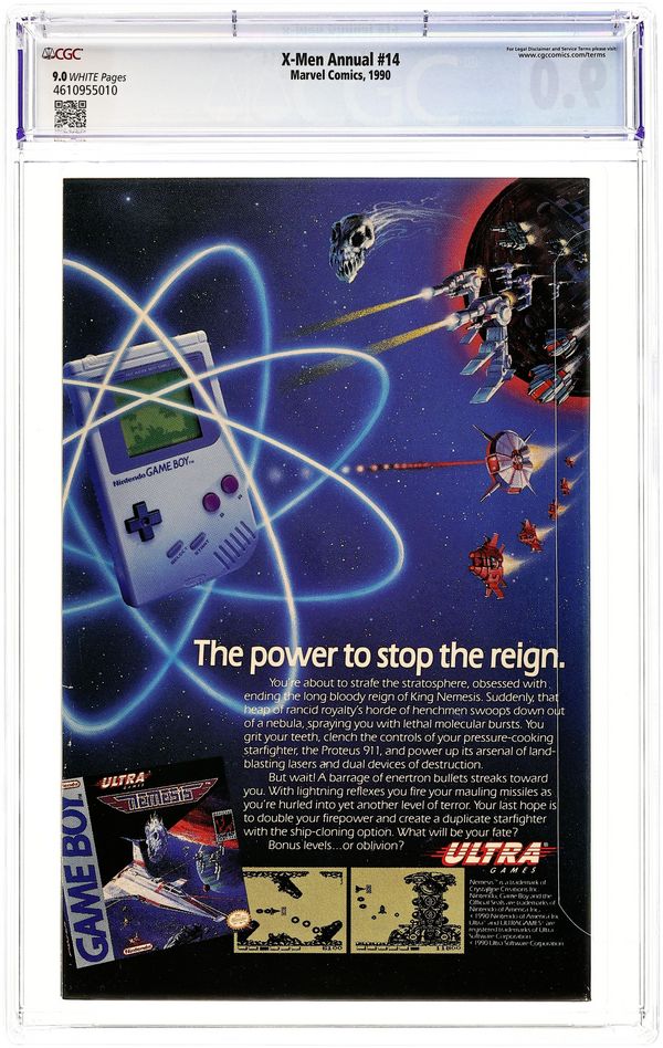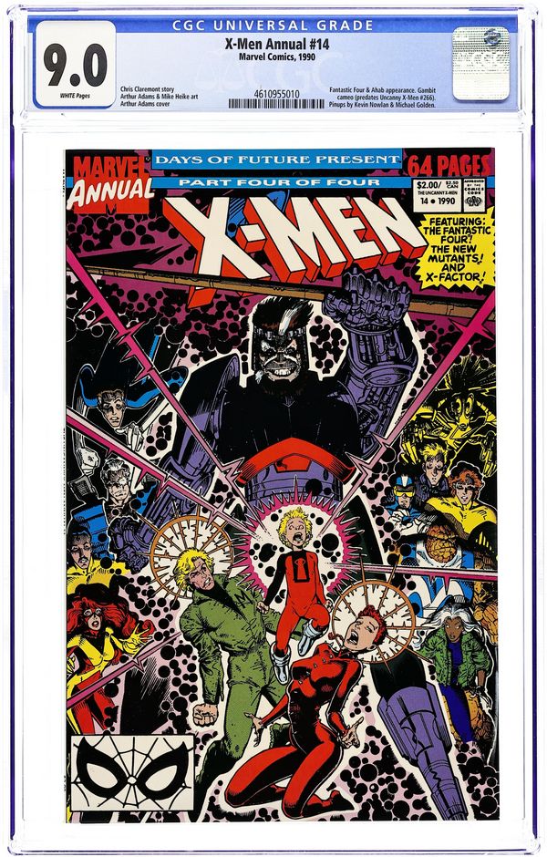 Starts Dec 8 Direct Edition. Days of Future Present part four of four "You Must Remember This" Guest starring the Fantastic Four, the New Mutants, and X-Factor. Script by Chris Claremont, pencils by Art Adams, inks by Dan Green, Bob Wiacek, Al Milgrom, Art Thibert, and Steve Mancuse. First appearance of Gambit (brief cameo). Wolverine, Jubilee, and Psylocke star in "The Fundamental Things." Script by Claremont, pencils by Mark Heike, inks by Geof Isherwood. Pin-ups by Kevin Nowlan and Michael Golden. Adams cover. 68 pgs. Cover price $2.00. Grade: CGC 9.0 explanation of grade Condition: Used (collectible)
