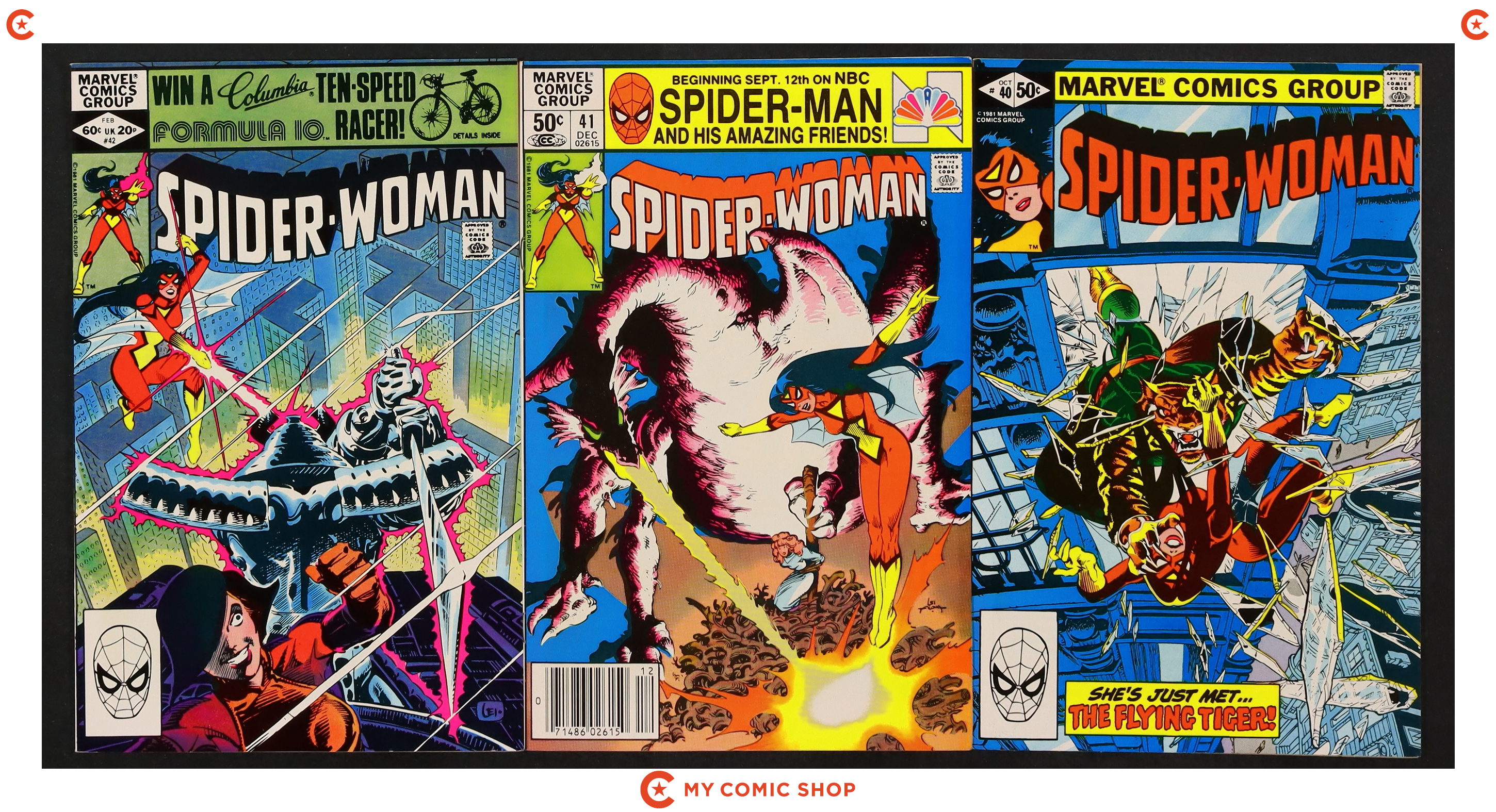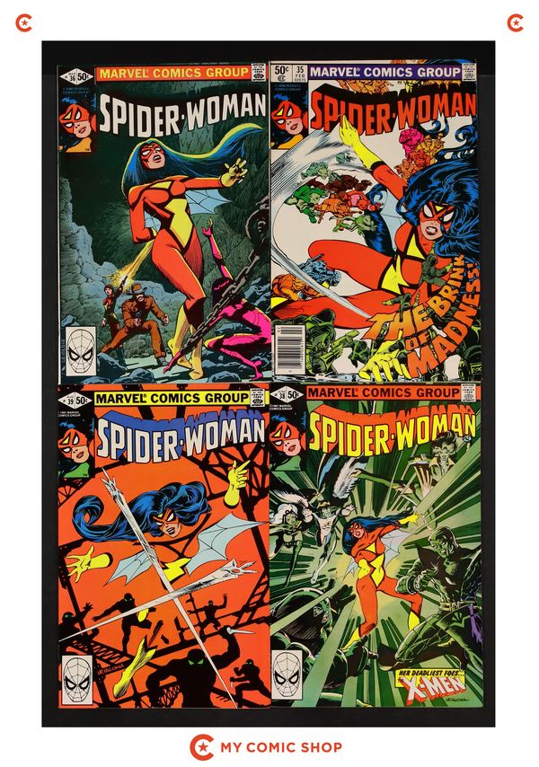 Issues 35, 36, 38-40, 41N, and 42 of Spider-Woman (1978 Marvel 1st Series). Most will grade in the VF to FN+ range.