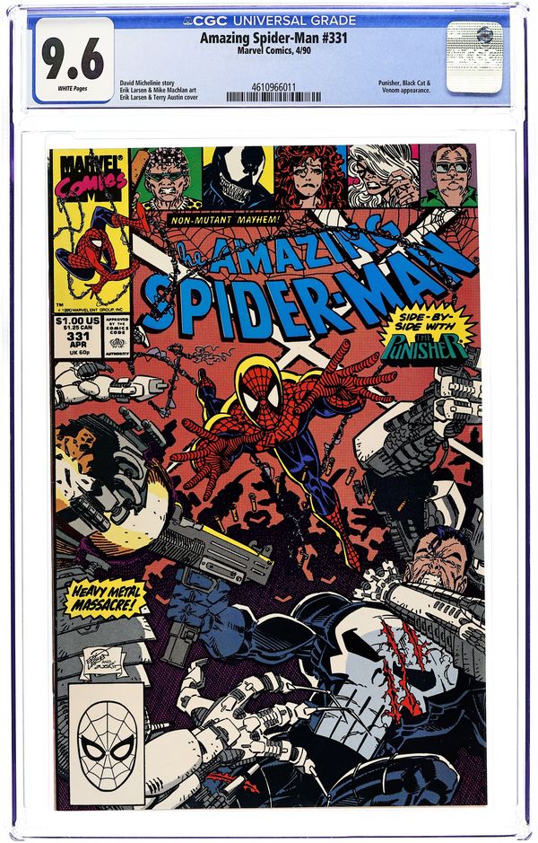 Ends Dec 8 7:22 PM CST Bid History 3 bids Current Bid $11 Your Secret Max Bid If you'd like to bid, please log in or register. Direct Edition. "The Death Standard" Part 2 of 2. Guest-starring the Punisher. Script by David Michelinie. Pencils by Erik Larsen. Inks by Mike Machlan. Cover by Erik Larsen and Terry Austin. To destroy the largest cocaine stockpile in the United States, the Punisher and the wondrous wall-crawler break into a secret federal installation in upstate New York! The web-slinger can't believe the government has joined the drug trade! But the Punisher doesn't care who's doing what! He's going to obliterate those drugs or die trying! Meanwhile in Colorado, Venom escapes from the Vault again! And in Soho, the Black Cat scares Mary Jane! Big problems are looming for your friendly neighborhood Spider-Man next issue! Cameo appearance by Microchip. (Note: Spider-Man and the Punisher previously worked together in Punisher War Journal (1988 1st series) 14 & 15.) 36 pages. Cover price $1.00. Grade: CGC 9.6 explanation of grade Condition: Used (collectible)
