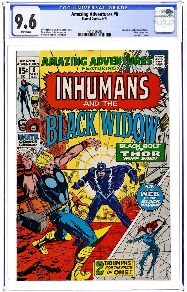 Last 15-cent cover price. Cover by Neal Adams. "An Hour For Thunder!", script by Roy Thomas, pencils by Neal Adams, inks by John Verpoorten; The Avengers (Captain America, the Scarlet Witch, the Vision, Quicksilver, Goliath) watch Mr. Dibbs and Black Bolt threaten the tenements on a view screen and make plans to travel to San Fran, but Thor insists on going to confront Mr. Dibbs alone; The other Avengers don't know that Don Blake was the one who diagnosed Mr. Dibbs with terminal cancer, and when Thor arrives he struggles briefly with the royal family who are attempting to get Black Bolt to recognize them; Thor fails to talk Mr. Dibbs into accepting a peaceful resolution and reluctantly dispatches him with his hammer; Plot crossover with The Avengers (Marvel, 1963 series) #95. "How Shall I Kill Thee? Let Me Count the Ways!", script by Gerry Conway (Plot) and Roy Thomas (Writer), pencils by Don Heck, inks by Bill Everett; The Black Widow and Ivan are captured by a racist German, the Watchlord, who loathes all Russians due to his childhood involving the Russian invasion of Germany; He wraps Natasha up in floorboards but Ivan rescues her and they escape; A boulder crushes the Watchlord. The Black Widow feature ends with this issue. 36 pgs, full color. $0.20. Cover price $0.15. Grade: CGC 9.6 explanation of grade Condition: Used (collectible)