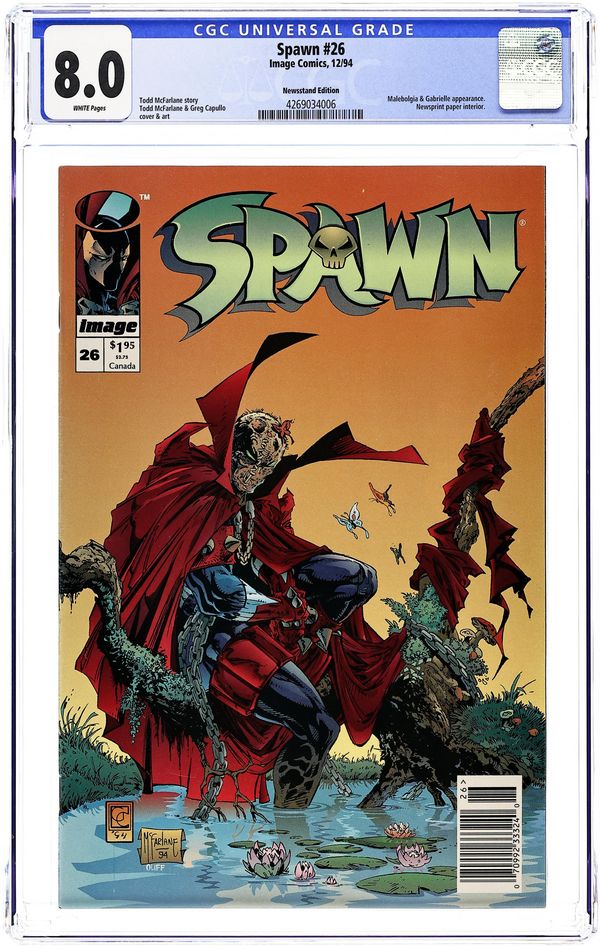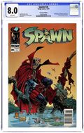 Newsstand Edition. "The Dark!" Story by Todd McFarlane. Art by Todd McFarlane and Greg Capullo. The mysterious Cagliostro is back to tutor Spawn in the rules of the game. Plus, Spawn is recruited by the forces of Heaven. The question is...will he accept their offer? Includes a 2-page pin-up of Spawn by Tim Townsend. Cover price $1.95. Grade: CGC 8.0 explanation of grade Condition: Used (collectible)