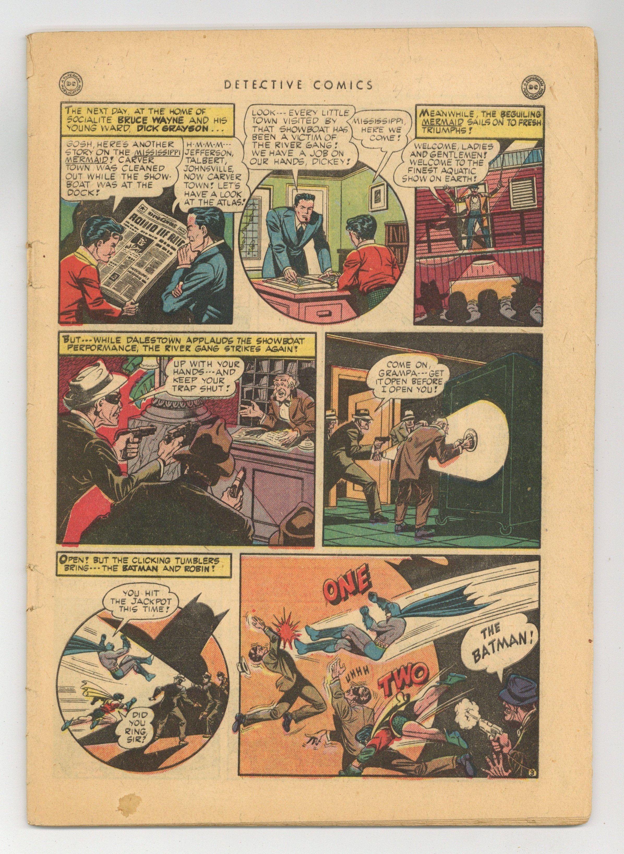 Cover art by Dick Sprang. Crime Between the Acts starring Batman and Robin, script by Joseph Greene, art by Dick Sprang. Commando Performance starring The Boy Commandos, art by Louis Cazeneuve. Three-Ring Binks story, script and art by Jack Farr. The Warpath text story by Devon Taylor. Battle of the Fans starring Air Wave, art by George Roussos. The Double Steal starring Slam Bradley, art by Martin Naydel. 52 pgs. $0.10. Cover price $0.10. Grade: Coverless explanation of grade Condition: Used (collectible)