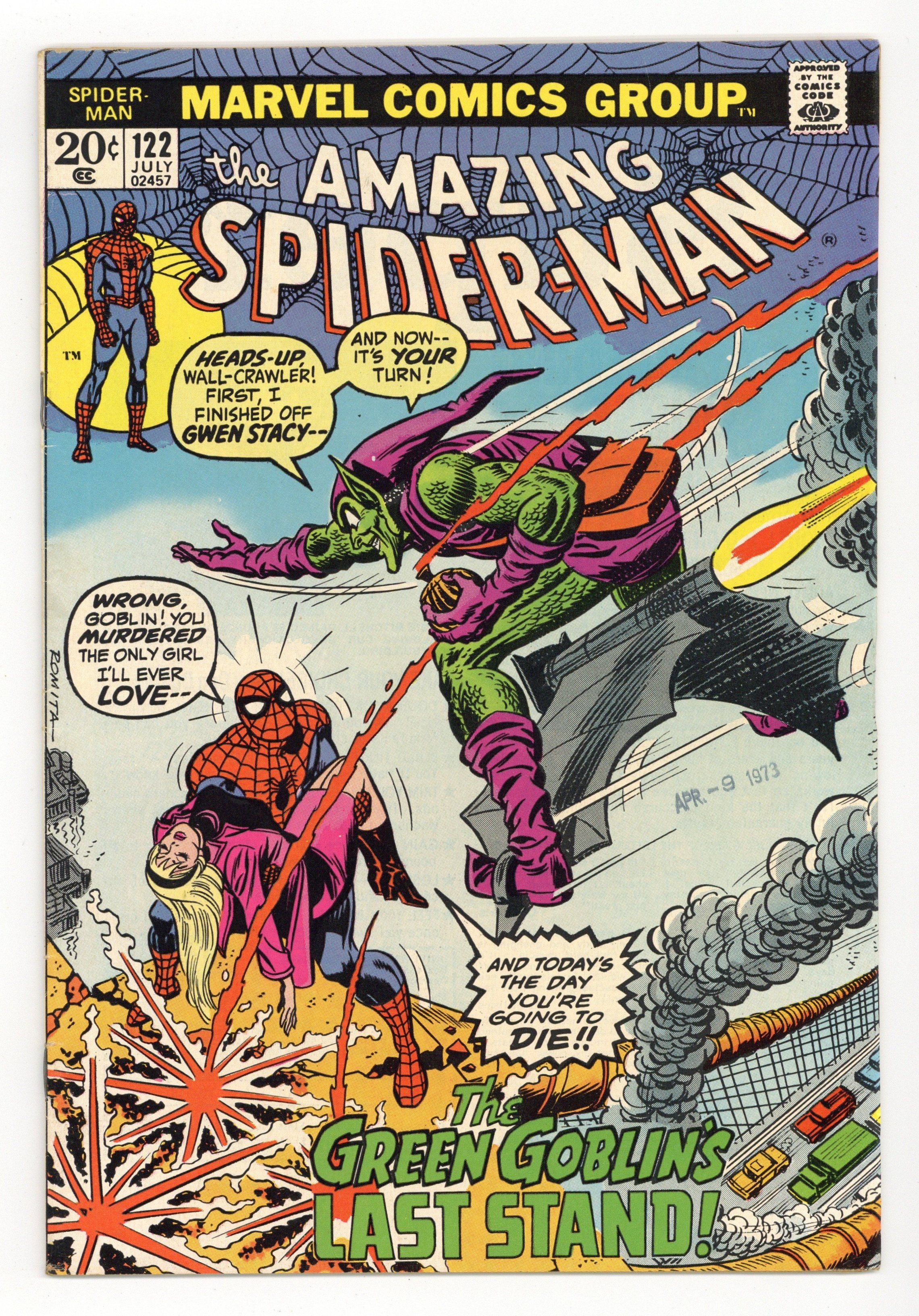 Death of the Green Goblin (aka Norman Osborn) in "The Goblin's Last Stand!" Part 2 of 2. Script by Gerry Conway. Pencils by Gil Kane. Inks by John Romita and Tony Mortellaro (backgrounds). Cover by John Romita. In unfathomable fashion atop the Brooklyn Bridge, Gwen Stacy perished at the hands of the Green Goblin. Spider-Man is devastated. And he furiously lashes out at the goblin, but the purple and green-clad killer gets away! However, a while later, the wall-crawler receives a tip from Joe Robertson about Norman Osborn's whereabouts. And in an abandoned and decrepit warehouse, the Amazing Spider-Man and the Green Goblin fight for the final time! At the end of their epic battle, Peter Parker painfully realizes that revenge is bittersweet. The passing of the goblin won't bring back Gwen. He must find a way to move forward with his life. Perhaps Mary Jane Watson will help. Cameo appearances by Harry Osborn and J. Jonah Jameson. (Notes: The stunning death scene of the Green Goblin inspired a similar moment in the2002 Spider-Man movie. This issue was reprinted in Marvel Tales #99 and again in issue 192.) 36 pages. Cover price $0.20. Grade: FN- 5.5 explanation of grade Condition: Used (collectible)