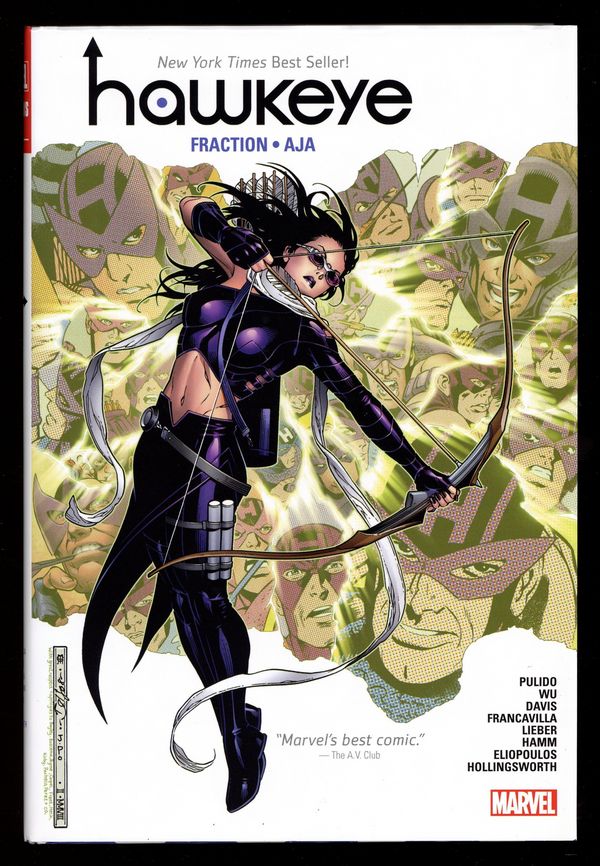 2nd Edition - 1st printing. Collects Hawkeye (2012 4th Series) #1-22 and ANNUAL #1, and Young Avengers Presents (2008) #6. Written by Matt Fraction. Art by David Aja, Javier Pulido, Steve Lieber, Jesse Hamm, Francesco Francavilla, Chris Eliopoulos, Annie Wu, Alan Davis, and Mark Farmer. Cover by Jim Cheung. Back Cover by David Aja. Matt Fraction and David Aja's critically acclaimed run in a single sharpshooting volume! With Young Avenger Kate Bishop by his side, Clint Barton continues his fight for justice - and good rooftop BBQs! He's hoping for some downtime from being one of Earth's Mightiest Heroes - but when the apartment building he's moved into, and the neighbors he's befriended, are threatened by a tracksuit-wearing, dog-abusing gang of Eastern European mobsters who say "bro" an awful lot, Clint must stand up and defend his new adopted family...any way he can. It's Hawkguy, Katie-Kate, Pizza Dog and friends against the Clown, Madame Masque, the Tracksuit Draculas and more in a fantastic, Eisner Award-winning reinvention of the arrowed Avenger! Bro, you read this book. Okay, bro? Hardcover, 8 1/2-in. x 11-in., 552 pages, full color. Rated T+ Cover price $100.00. Grade: NM 9.4 explanation of grade Condition: Used (collectible)