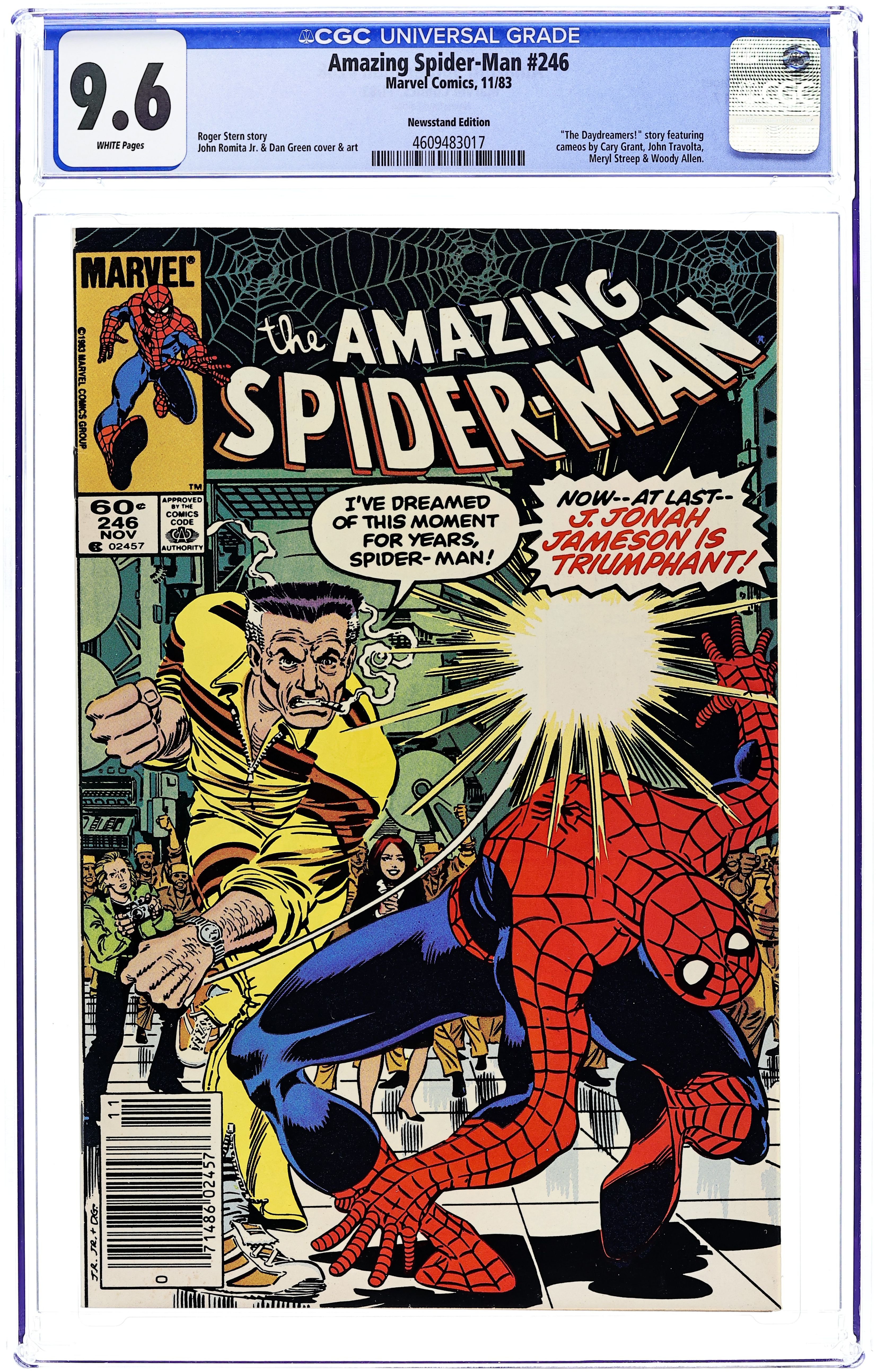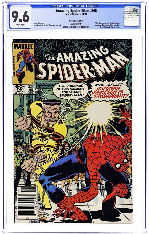 Starts Dec 8 Newsstand Edition. "The Daydreamers!" Script by Roger Stern. Pencils by John Romita Jr. Inks by Dan Green. Cover by John Romita Jr. and Dan Green. The Watcher narrates the daydreams of four wishful souls: Felicia Hardy, J. Jonah Jameson, Mary Jane Watson, and Peter Parker! The Black Cat imagines robbing from the rich and giving to the poor alongside her favorite web-slinger! Jonah fantasizes about punching out the wall-crawler! Mary Jane dreams of seeing her name in the marquee lights of Broadway! And the Amazing Spider-Man yearns for respect as a photographer, scientist, and superhero! A fun issue! Cameo appearances (as part of dream sequences) by the Fantastic Four, Captain America, Iron Man, Doctor Doom, Doctor Octopus, Loki, the Absorbing Man, Kraven the Hunter, Meryl Streep, John Travolta, Woody Allen, and Cary Grant. (Note: This same month Spider-Man guest stars in Avengers 236 & 237.) 36 pages. Cover price $0.60. Grade: CGC 9.6 explanation of grade Condition: Used (collectible)