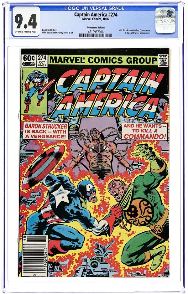 Ends Dec 8 7:48 PM CST Bid History 2 bids Current Bid $9 Your Secret Max Bid If you'd like to bid, please log in or register. Newsstand Edition. "Death of a Hero!" Part 2 of 2. Guest-starring Nick Fury. Script by David Anth0ny Kraft. Pencils by Mike Zeck. Inks by John Beatty. Cover by Mike Zeck and John Beatty. Hydra has stolen a Strategic Air Command B-52 -- that serves as an Aerial Command Center for the United States' arsenal of nuclear missiles! The Howling Commandos know that they must get the B-52 back! So Captain America, Nick Fury, and the commandos invade Hydra Island to recover the bomber...and rescue General Sawyer. Tragically, one howling commandodoes not leave the island alive. Which one? 32 pages. Cover price $0.60. Grade: CGC 9.4 explanation of grade Condition: Used (collectible)