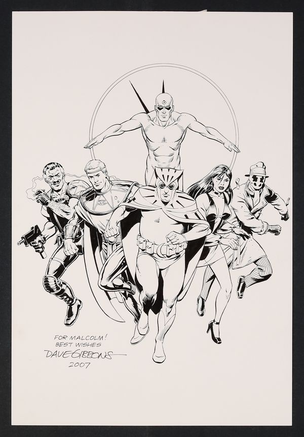 Signed by Gibbons (personalized to 'Malcom'). Blue line pencil and ink on the reverse of DC Comics art board. 11" x 17".