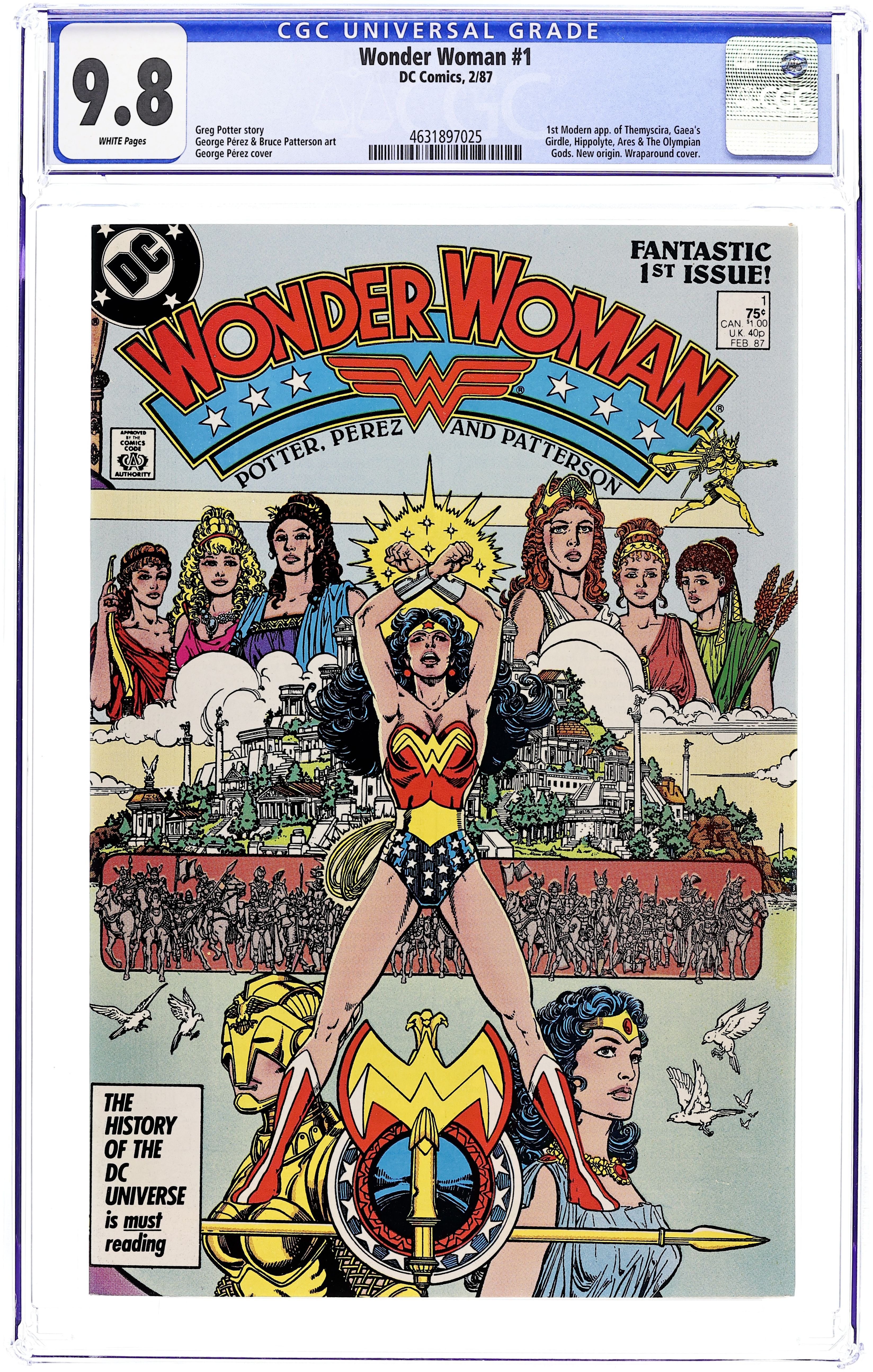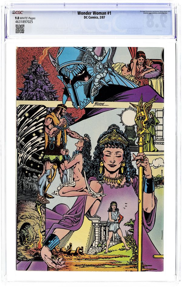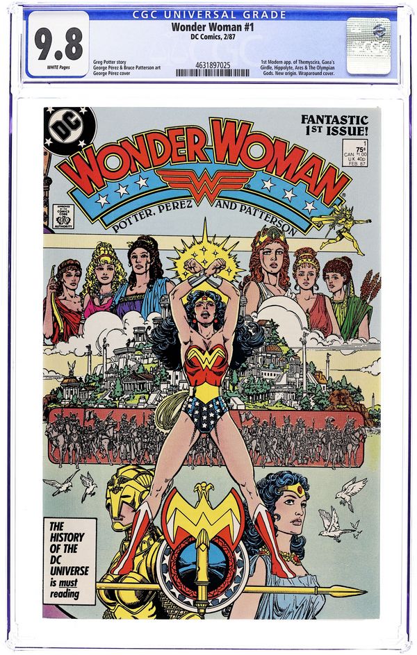 Direct Edition. In this post-Crisis on Infinite Earths re-imagining of the Wonder Woman mythos, Diana is born of clay, growing on Paradise Island to become the champion of the Amazons. "The Princess and the Power!" Part 1 of 6, continued next issue. Script by Greg Potter, co-plot and pencils by George Perez, inks by Bruce Patterson. Perez inks first 2 pages and the final page. Wrap-around cover. No ads. Perez cover. 36 pgs. Cover price $0.75. Grade: CGC 9.8 explanation of grade Condition: Used (collectible)