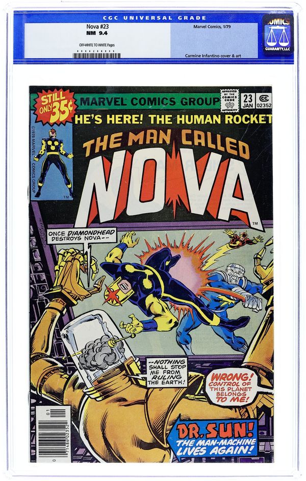 Guest-starring the Comet. Story by Marv Wolfman. Art by Carmine Infantino and M. Hands. Plus, a special 2 page interlude by Gene Colan and Tom Palmer (Tomb of Dracula). Nova and the Comet get thrashed by the nigh unstoppable Diamondhead. This leaves the Human Rocket vulnerable and at the mercy of Dracula's old nemesis Dr. Sun. Plus, witness the return of the enigmatic Sphinx. 32 pages. Cover price $0.35. Grade: CGC 9.4 explanation of grade Condition: Used (collectible)
