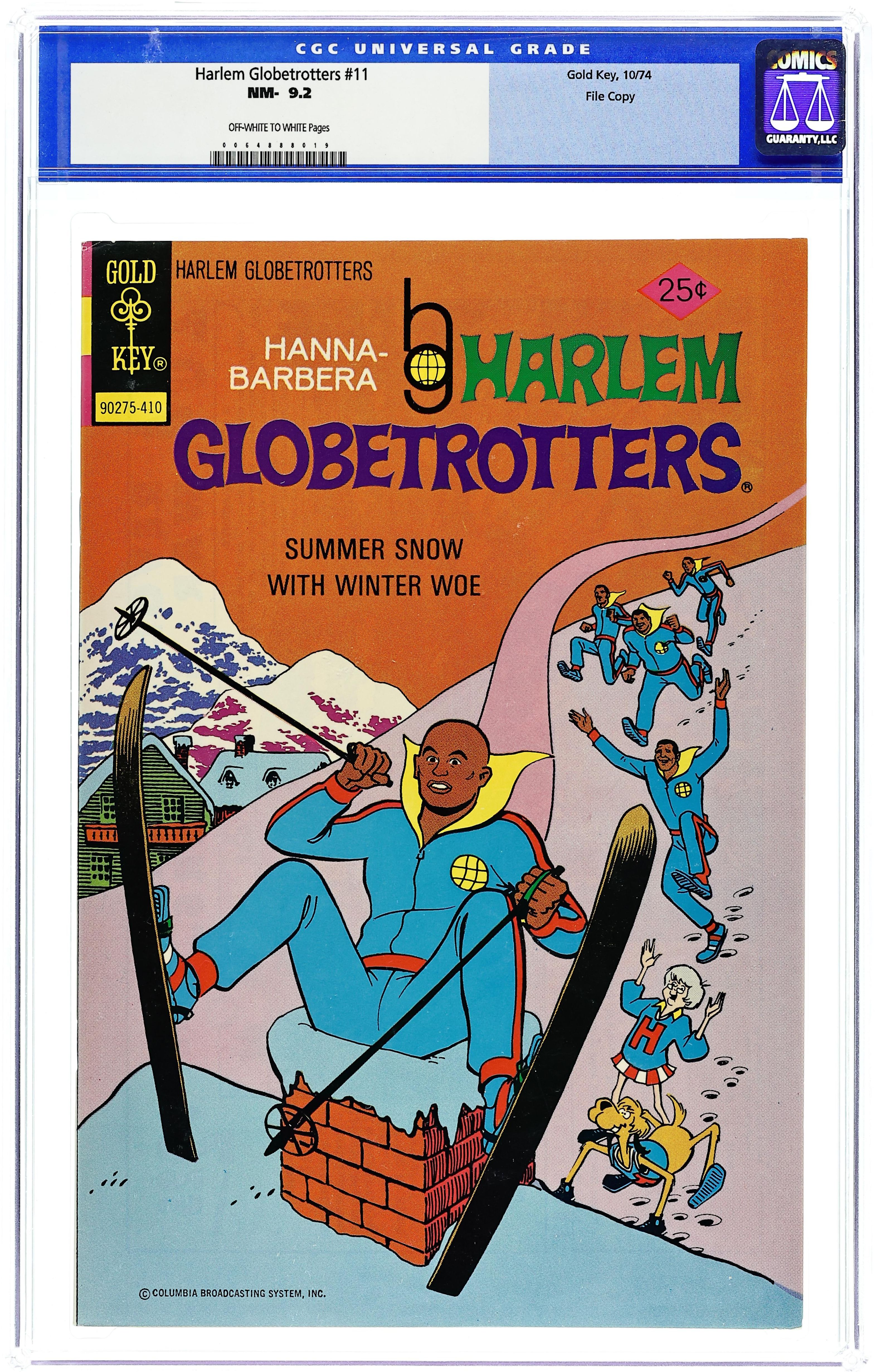 First 25c cover-priced issue. Number on cover: 90275-410. Summer Snow with Winter Woe - Written by Don R. Christensen. Art and Cover by Dan Spiegle. Comic book adaptation of the Hanna-Barbera cartoon version of the real-life performing basketball team. In this issue: Who says basketball and skiing don't mix? Characters in this story: Meadowlark Lemon; Geese; Pab; Curly; BJ; Granny; Dribble (the dog). 32 pages, full color. Cover price $0.20. Grade: CGC 9.2 explanation of grade Condition: Used (collectible)