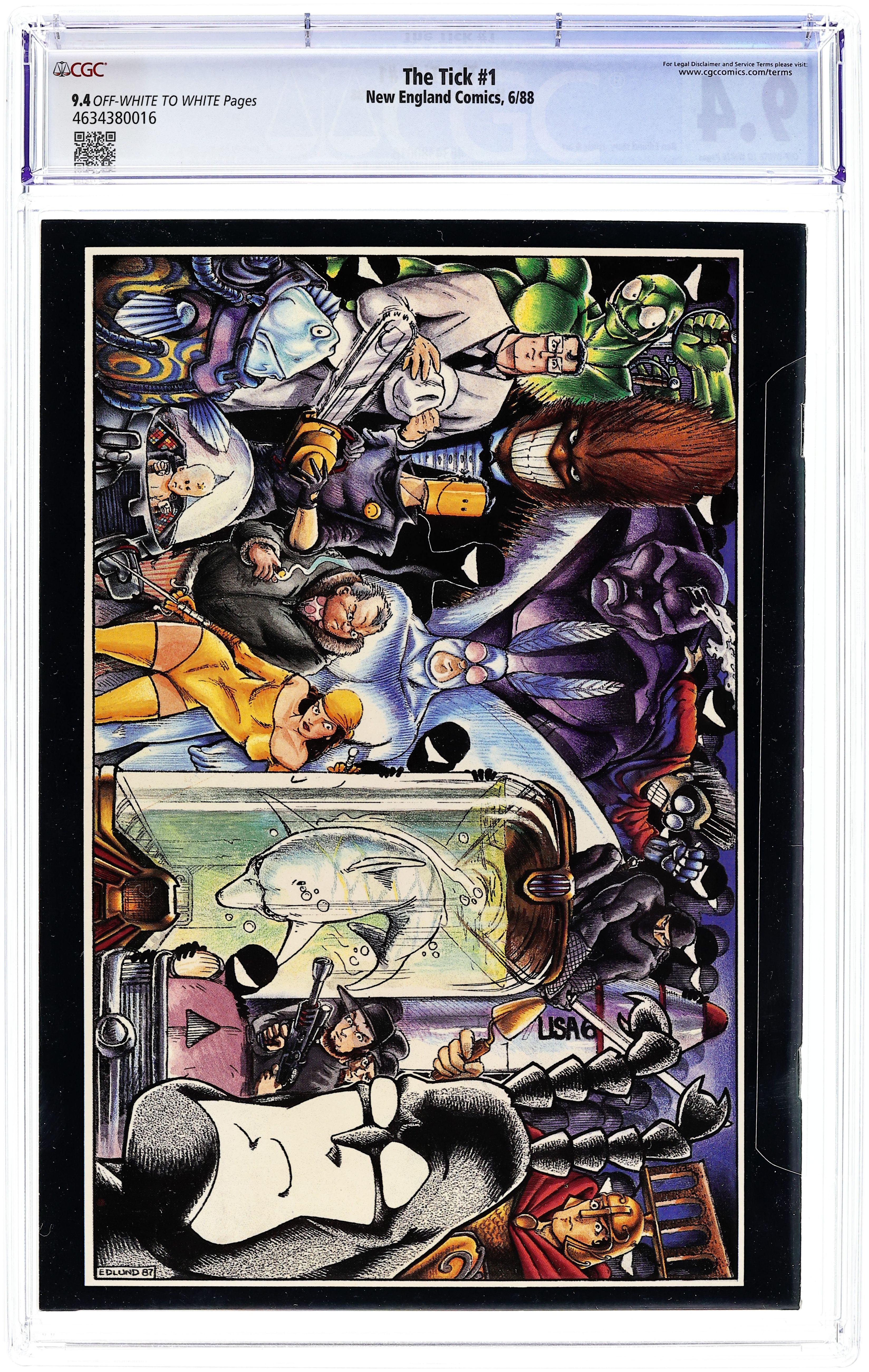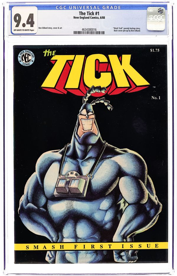 (2nd Edition) inside cover. This is a first printing of Tick #1, but Tick #1 reprints the serially numbered Tick Special Edition (1st appearance) w/minor changes. NOTE: This is a 1st Printing. 1st printings do not have a 2nd or later printing notice in indicia. Written by Ben Edlund. Art and cover by Ben Edlund. The Tick arrives straight from the nuthouse and into The City where he decides to be a superhero; After having a tussle with ninjas and being run over by a train, he is no closer to realizing his lofty goals. One page art lesson on how to draw The Tick by Ben Edlund. 36 pgs., B&W. $1.75. Cover price $1.75. Grade: CGC 9.4 explanation of grade Condition: Used (collectible)