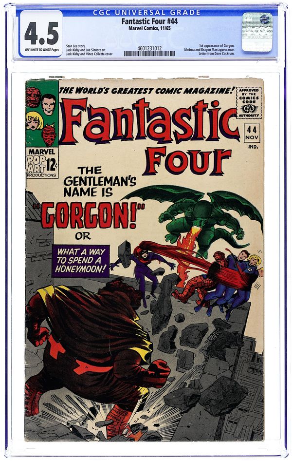Ended Nov 10 8:06 PM CST Bid History 9 bids Winning Bid $37 Cover pencils by Jack Kirby, inks by Vince Colletta. The Gentleman's Name Is Gorgon! or What a Way to Spend a Honeymoon!, script by Stan Lee, pencils by Jack Kirby, inks by Joe Sinnott; Medusa seeks the FF's help in eluding Gorgon. Dragon Man appearance. Letter to the editor from Dave Cockrum. 36 pgs. $0.12. Cover price $0.12. Grade: CGC 4.5 explanation of grade Condition: Used (collectible)