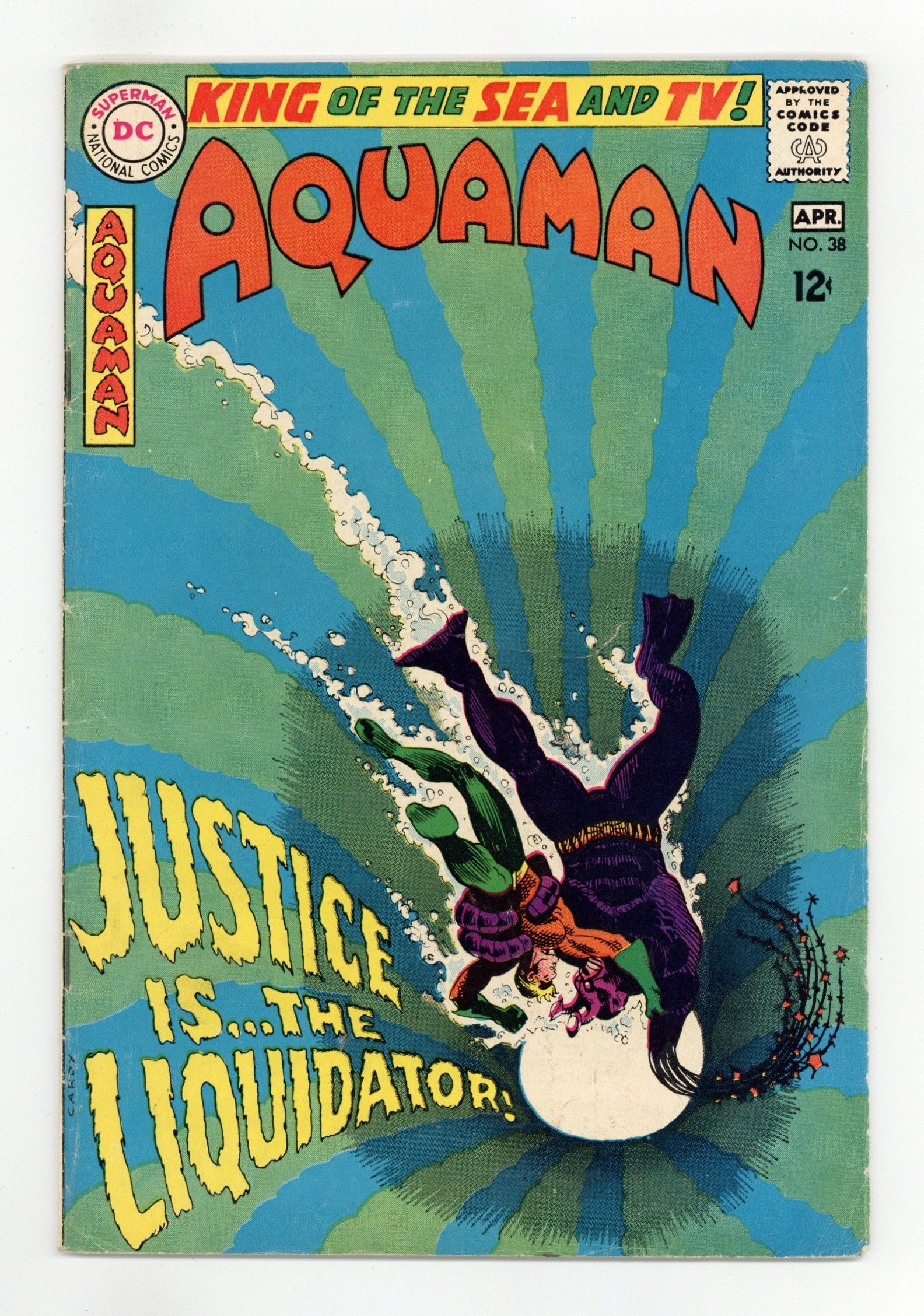 Starts May 11 Cover art by Nick Cardy. Justice is Mine, Saith the Liquidator! starring Aquaman, Aqualad, Mera, The Liquidator, and Lord Ragnar, script by Bob Haney, art by Nick Cardy; Ragnar usurps Aquaman's throne; Aquaman battles The Liquidator; Ragnar is responsible for the attacks. Stan Goes Skin Diving humor page by Henry Boltinoff. Statement of ownership--average print run 404,000; average paid circulation 234,200. 36 pgs. $0.12. Cover price $0.12. Grade: VG 4.0 explanation of grade Condition: Used (collectible)