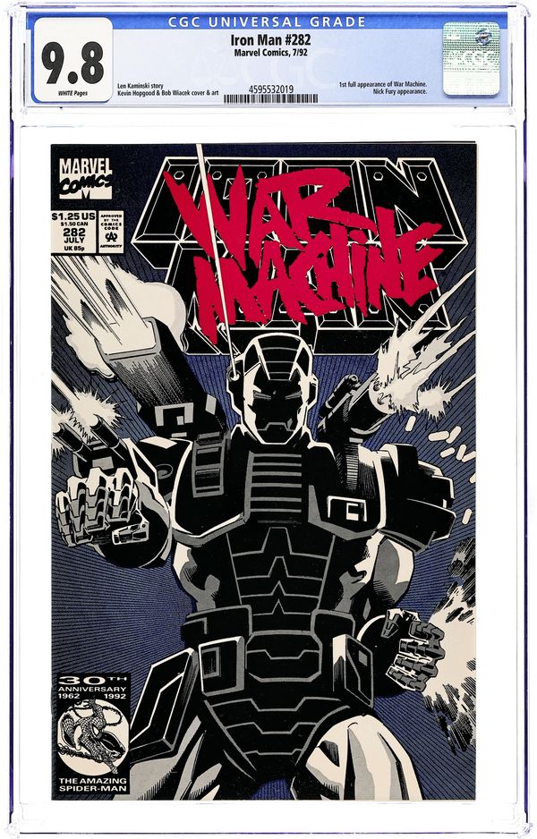 Ended Nov 17 8:46 PM CST Bid History 12 bids Winning Bid $143 Direct Edition. "War Machine" Part 2 of 3. First (full) appearance of the War Machine armor. Script by Len Kaminski. Pencils by Kevin Hopgood. Inks by Bob Wiacek. Cover by Kevin Hopgood and Bob Wiacek. The Masters of Silence came to Stark Enterprises last issue looking for a fight! And now the trio is getting one in spades thanks to the War Machine armor! In a remarkable display of firepower; Tony Stark, clad in the new gray & white armor, trounces his would-be assassins! In the meantime, Jim Rhodes contacts SHIELD to learn who framed Stark Enterprises for the deadly accident in Japan! And it turns out to be someone the armored avenger knows very, very well! Cameo appearances by Justin Hammer and Nick Fury. (Note: The cover to issue 282 was reprinted as the cover to Iron Man (1968 1st series) Marvel Legends Reprint 281.) 32 pages. Cover price $1.25. Grade: CGC 9.8 explanation of grade Condition: Used (collectible)