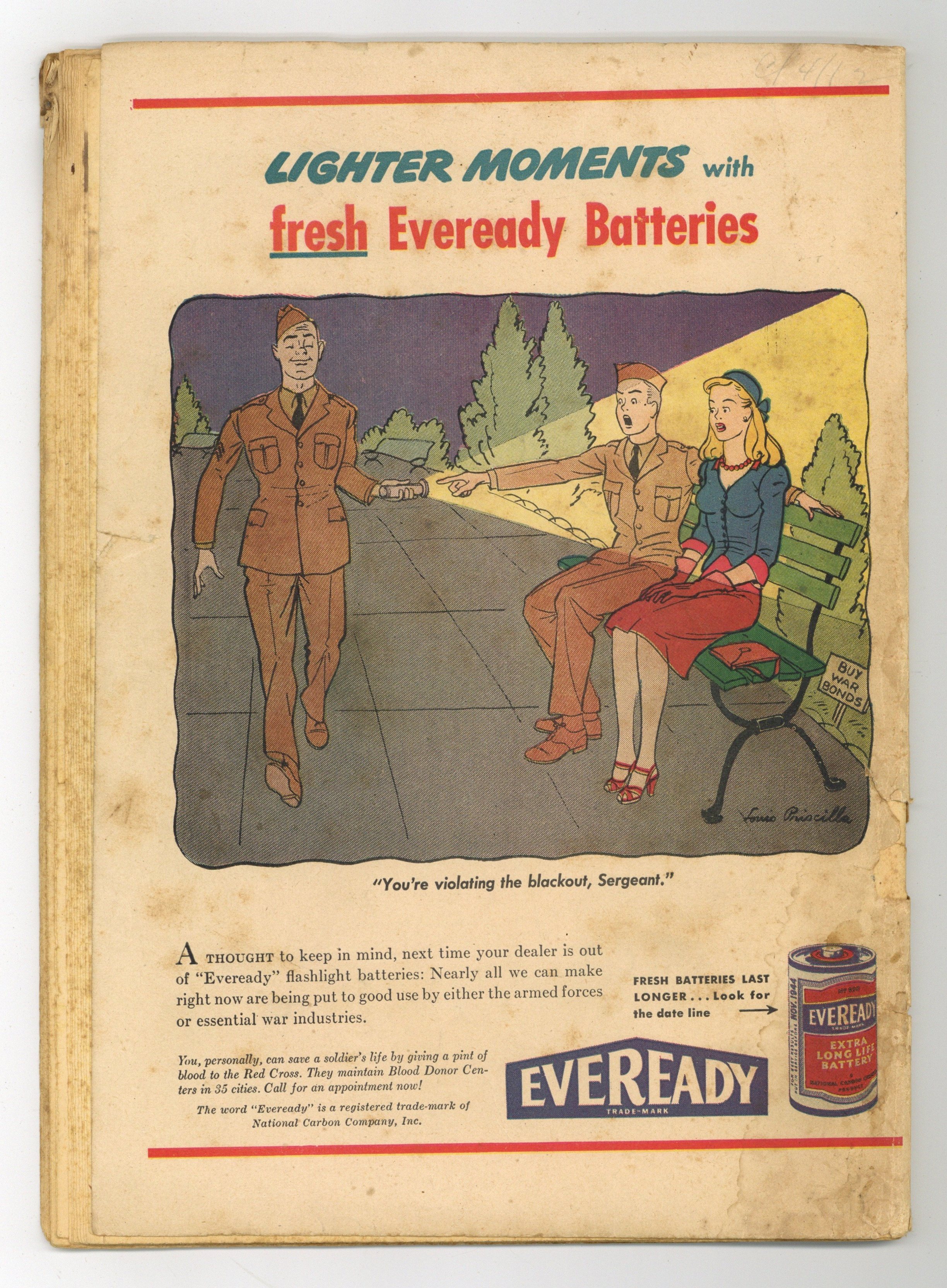 Cover by Dick Sprang. "The Upside Down Crimes!", script by Bill Finger, pencils by Dick Sprang (as Bob Kane), inks by Gene McDonald; Batman and Robin must stop the Joker's mad schemes, as he commits several "upside down crimes" that leave the Caped Crusaders literally standing on their heads. 1-page Life's Little Laffs story by Ray Houlihan. "Damsel in Distress!", script by Don Cameron, art by Dick Sprang (as Bob Kane); Dick's crush on a girl leads him and the Batman into a case involving kidnapping and murder. 1-page Handy Andy story by Jack Farr. "Borrowed Butler!", art by Jerry Robinson (as Bob Kane); Bruce hires out Alfred to a neighbor who is having week-end guests, and whose butler is sick. "Accidents Will Happen" text story by Tod Lowry. "Pelt Plunderers!", script by Bill Finger, art by Dick Sprang (as Bob Kane); Batman and Robin head up into the frozen north to assist the Royal Canadian Mounted Police stop a gang of thieves who plunder beaver pelts trapped by locals and who then sell them for big profits, which they plan to spend back in the States. 52 Pages, Full Color. Cover price $0.10. Grade: GD- 1.8 explanation of grade Condition: Used (collectible)