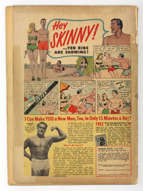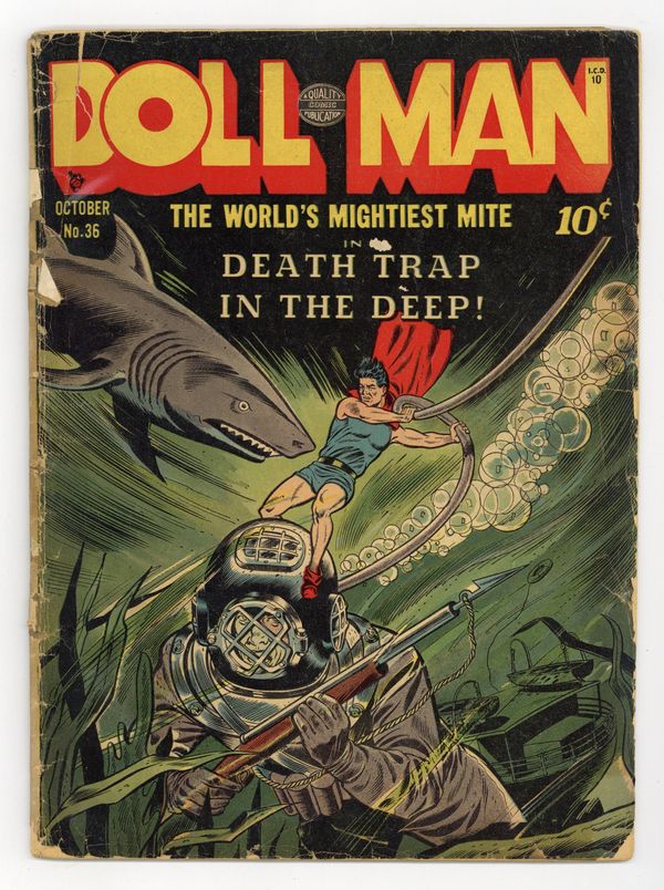 Death Trap In the Deep starring Doll Man, Captain Torger, Vornich, and Matty, art by Ross Andru. Brush Your Teeth With Britto starring Torchy, art by Gill Fox. Secret Six starring Doll Man, art by Ross Andru; Darrel wanders into Chinatown and is nearly captured by a strange group called "The Secret Six," who plan to assassinate a Judge Benton. Doll Man Versus Elmo; Knowing that the Doll Man often uses Darrel Dane's lab, a group of gangsters intend to eliminate the Doll Man by substituting a vicious look-alike mutt for the domesticated dog owned by Dane. 36 pgs. $0.10. Cover price $0.10. Grade: FR 1.0 explanation of grade Condition: Used (collectible)