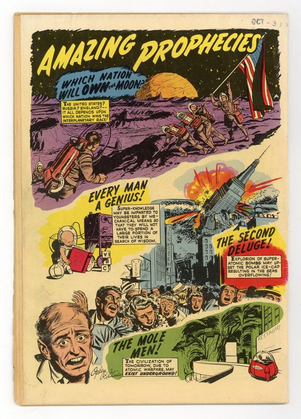 Starts Jan 3 Painted cover by Robert Gibson Jones. Stories and art by Wally Wood, Murphy Anderson, Ogden Whitney, Alex Schomburg, Jerry Siegel and Harry Sahle. Sci-fi and fantasy from Ziff-Davis, edited by the legendary co-creator of Superman, Jerry Siegel. Fortune-hunters return to the lost city of the Winged People to steal the diamond eye of their idol, in a story with art by comics legend Wally Wood. Vince breaks up with his Martian girlfriend Kit-E and goes to find the legendary Asteroid Witch, in a story with art by comics legend Murphy Anderson. Professors Graves and Arnold's serum accidentally transports them into the 4th dimension, and they must enter the timestream to escape, in a story with art by Golden Age legend Alex Schomburg. Plus the one-pager "Amazing Prophecies" by Ogden Whitney. ("Which nation will own the moon?") Painted cover by famed science fiction illustrator Robert Gibson Jones (Fantastic Adventures, Amazing Stories). The Asteroid Witch; A-Day; Winged Death on Venus; Trespasser in Time; The Stone Men; Amazing Facts from Nature; Cosmic Comics; Amazing Prophecies. 32 pages, Full Color. Cover price $0.10. Grade: GD/VG 3.0 explanation of grade Condition: Used (collectible)