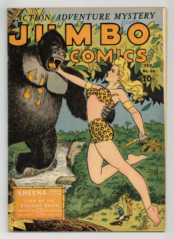 Cover by Art Saaf. Edited by Jerry Iger. Stories and art by Alex Blum, Arnold Hicks, and Robert Webb. An influential anthology starring jungle hero Sheena, featuring early art by legendary comics artists in the Eisner-Iger Shop. Sheena learns the gorillas who are abducting beautiful native maidens are just men in gorilla suits; An offbeat Ghost Gallery story at a circus features the ghosts of a lion tamer and his pet tiger; As Agent ZX-5's Philippine adventure continues, the comic shows an increasing tendency toward terrific good-girl art. The Hawk; Weird Stories of the Supernatural; Sheena, Queen of the Jungle; Ghost Gallery; Midnight the Black Stallion; Memo for Saturday: "Murder"; ZX-5 Spies In Action; Inspector Dayton. 56 pages, Full Color. Cover price $0.10. Grade: VG- 3.5 explanation of grade Condition: Used (collectible)