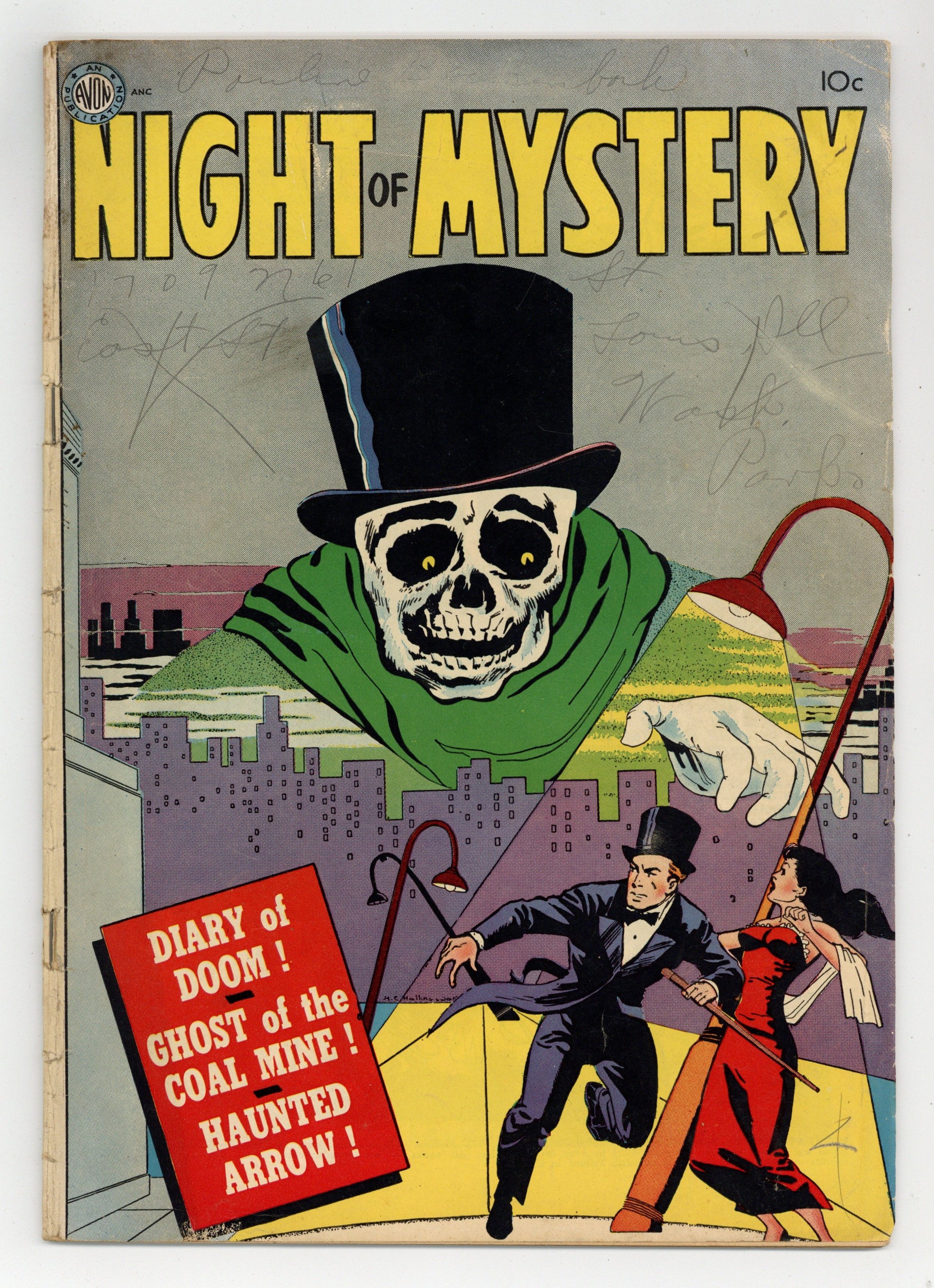 Art by Everett Raymond Kinstler, Norman Nodel, and Vince Alascia. Cover by Alvin Hollingsworth. Tales of pre-Code horror, curses, and vengeance from beyond the grave. A diary recounts a tale of men turning into monsters; An archer ill-advisedly ignores dreams about a cursed arrow; A killer searching for buried treasure inadvertently digs his own grave. Also featuring a moody, Jack Davis-style contents page illustrated by Everett Raymond Kinstler on the inside front cover. Night of Mystery; Diary of Doom!; The Horror in the Swamp; The Haunted Arrow!; The Strange Visitors!; The Giant From Earth!; The Ghost of the Coal Mine! 36 pages, Full Color. Cover price $0.10. Grade: GD+ 2.5 explanation of grade Condition: Used (collectible)