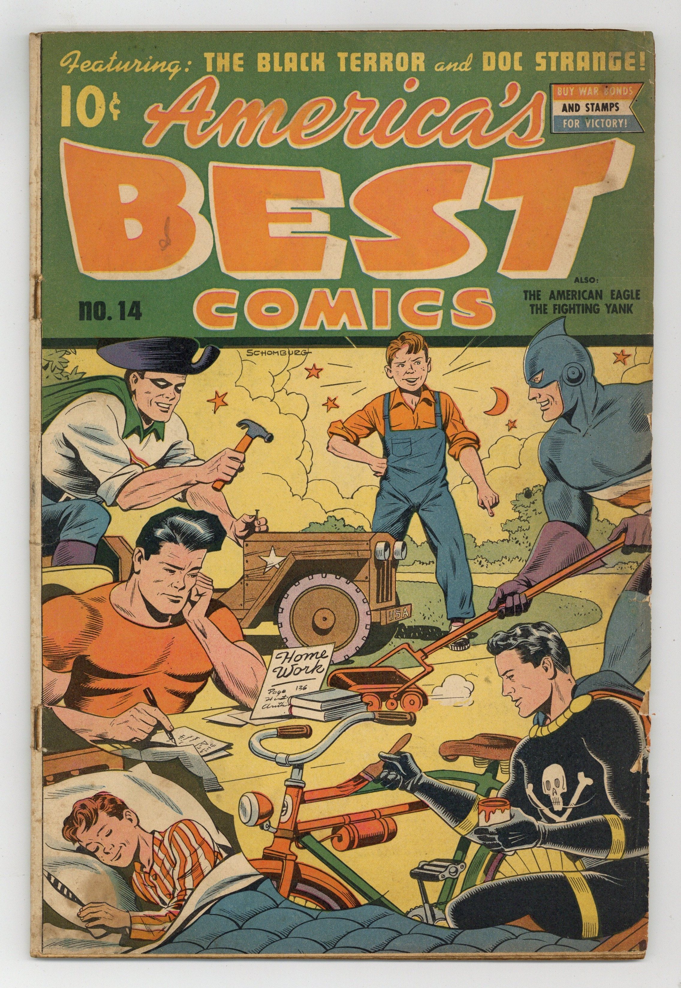 Cover by Alex Schomburg. Stories by unknown. Art by Ed Moritz and unknown. In this issue: untitled The Black Terror story (vs. The Master, introduction) with art by Ed Moritz; The Fighting Yank in "The Case of the Extra Nazi Prisoner" (vs. Baron Karl Mannfred Von Khill, introduction); untitled Doc Strange story; and untitled American Eagle story (vs. Dr. Amoto, introduction). Plus: 1-page text stories "Good Neighbor" (by Charles S. Strong; credited as William McClellan), "The Young Reporter" (by Johnston Craig) and "Deserted Cabin" (by Buck Benson). Also: untitled Bobby Bear 3-pager (by Thurston Harper). 48 pages, full color. Cover price $0.10. Grade: VG 4.0 explanation of grade Condition: Used (collectible)