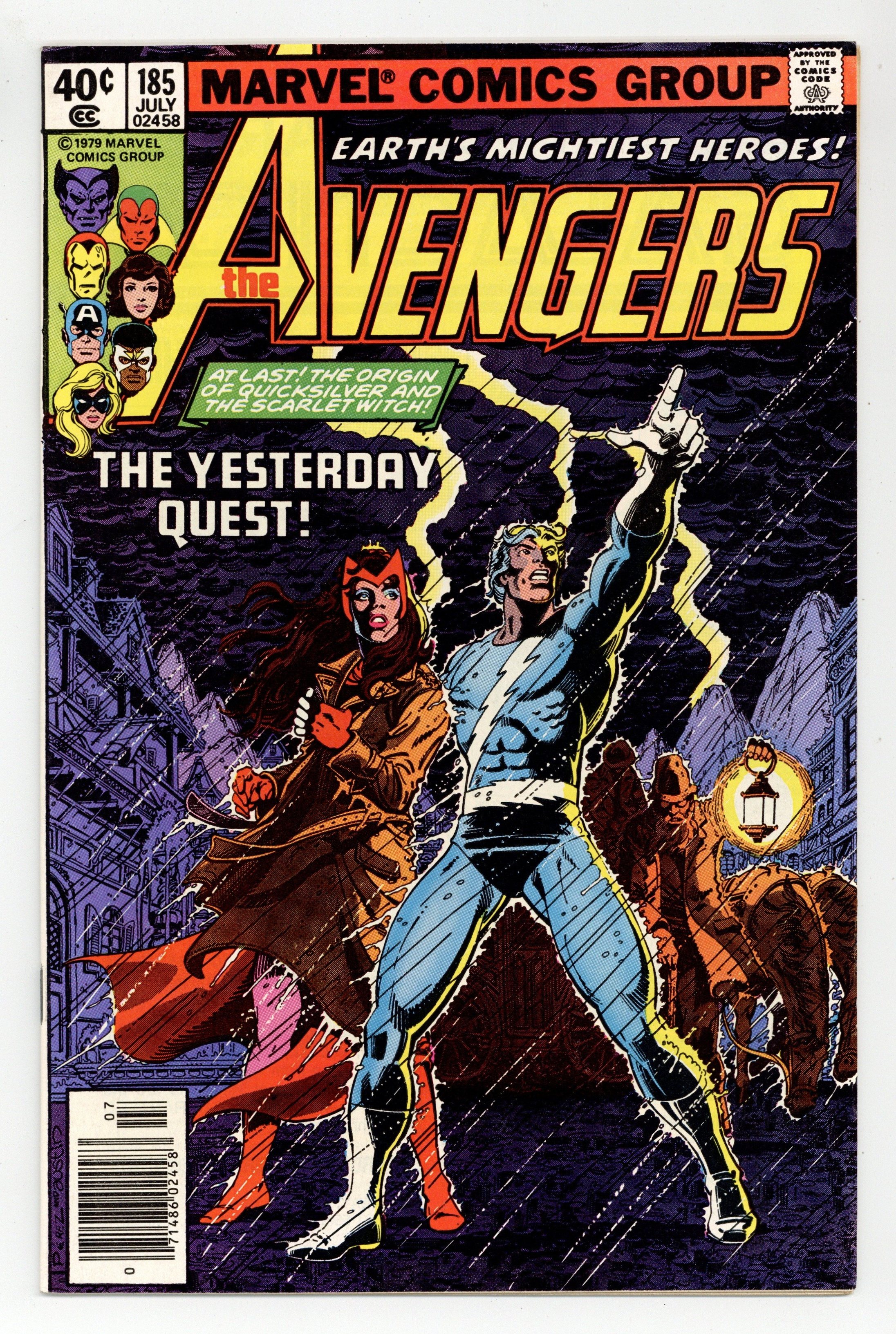Starts Dec 8 Newsstand Edition. "The Yesterday Quest!" Part 1 of 3. Plot by Mark Gruenwald and Steven Grant. Script by David Michelinie. Pencils by John Byrne. Inks by Dan Green. Cover by George Perez and Terry Austin. Ever since their first appearance in Uncanny X-Men 4 many years ago, the origin of Quicksilver and the Scarlet Witch has been a mystery to both comic readers and the siblings alike. After Wanda and Pietro arrive in Transia with Django Maximoff, clues to the twins' birthplace and birth parents begin to emerge. Modred the Mystic, the Darkhold, Bova the cow-woman, the High Evolutionary's former citadel, and Wundagore Mountain are all pieces to the puzzle. And the truth seems to lie at the top of the mountain. But there's something else at the top of Wundagore Mountain. Something ancient, something evil. Cameo appearance by Bova. Flashback cameos by Robert Frank, Madeline Frank, and the Toad. Avengers Lineup: Beast, Captain America, Falcon, Hawkeye, Iron Man, Jocasta, Ms. Marvel, Quicksilver, Scarlet Witch, Vision, and the Wasp. (Notes: Mark Gruenwald's participation in this three-part story was an indication of the storyline's importance to the continuity of the Marvel Universe. Modred previously appeared in Marvel Two-in-One 33. This issue includes a full-page ad for the Man-Thing's guest appearance in Micronauts 7.) 36 pages Cover price $0.40. Grade: VF 8.0 explanation of grade Condition: Used (collectible)