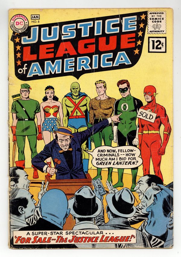 Ended Nov 17 8:48 PM CST Bid History 8 bids Winning Bid $17 Cover pencils by Mike Sekowsky, inks by Murphy Anderson. For Sale--The Justice League!, script by Gardner Fox, pencils by Mike Sekowsky, inks by Bernard Sachs; While Superman and Batman are away in Dimension X, small-time gangster Pete Ricketts finds a strange ray that he uses to turn the Justice League into a gang of mind-controlled criminals that he auctions off to the highest bidder. 36 pgs. $0.12. Cover price $0.12. Grade: FR/GD 1.5 explanation of grade Condition: Used (collectible)