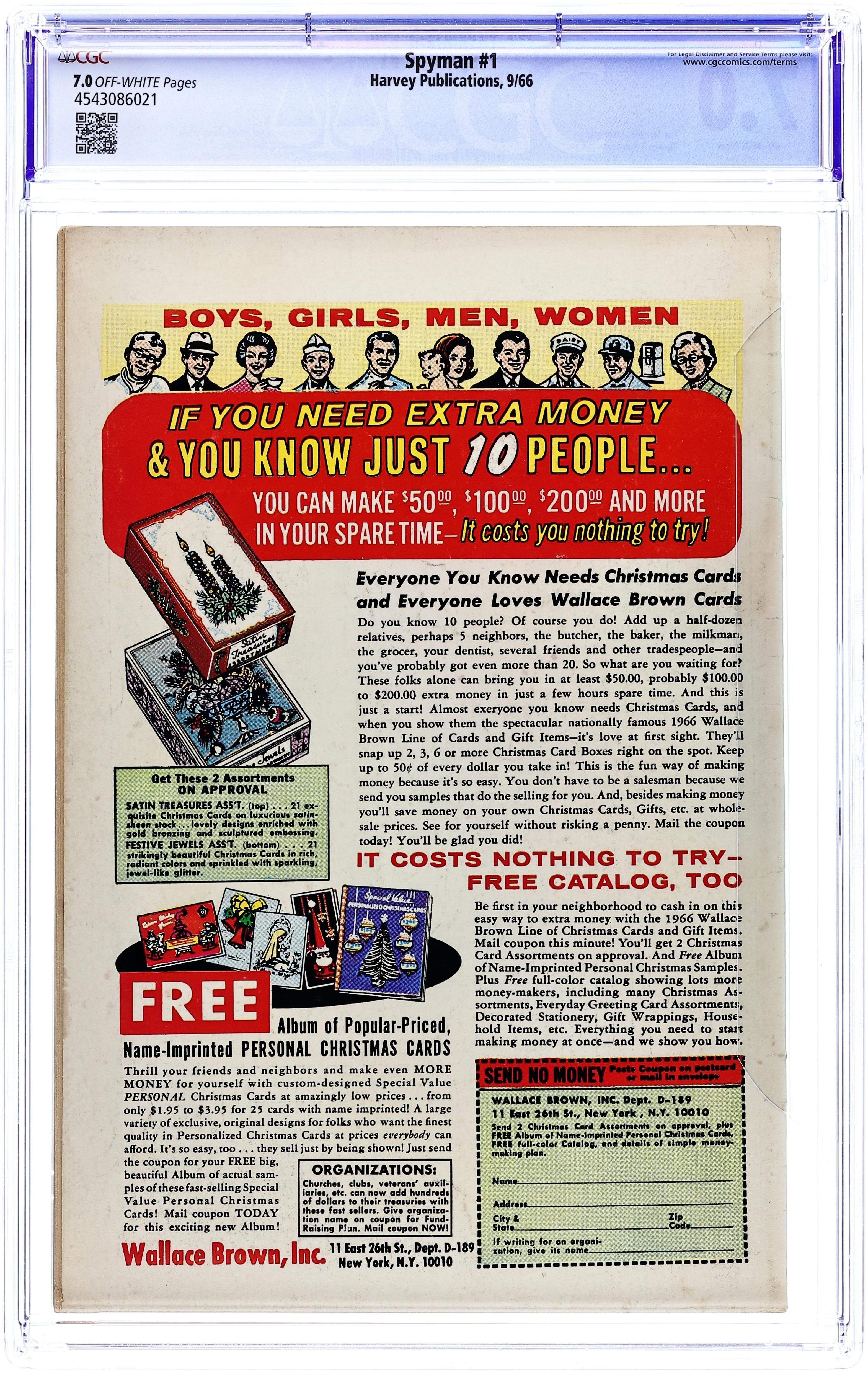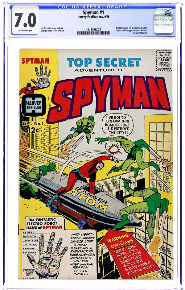 Starts Jan 3 Origin and first appearance of Spyman in "The Birth of a Hero," plus "Spyman at the Mercy of the Whisperer" and "How to Unmask a Villain." Art by George Tuska and Reed Crandall (inks). Jim Steranko splash page pencils (first pro work). 1 page Goodyear Aerospace ad drawn by Neal Adams. Rocky and Bullwinkle star in a one-page Cheerios ad. Tuska cover. 36 pages, full color. Cover price $0.12. Grade: CGC 7.0 explanation of grade Condition: Used (collectible)