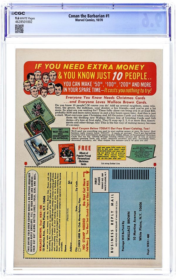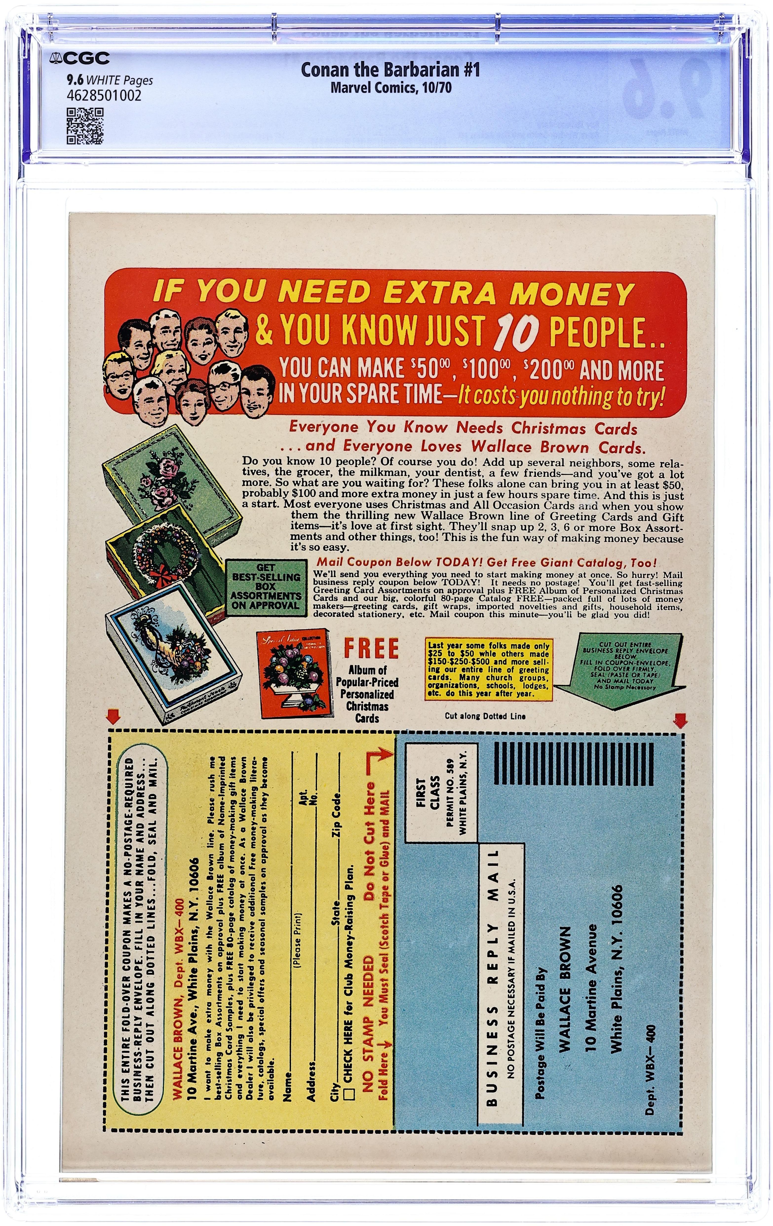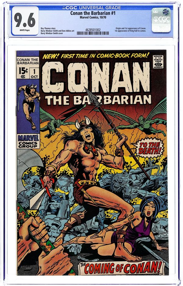 Starts Jan 3 Cover pencils by Barry Windsor-Smith, inks by John Verpoorten. First comic book appearance and origin of Conan. The Coming of Conan!, script by Roy Thomas, pencils by Barry Windsor-Smith, inks by Dan Adkins; Conan battles at Vanaheim and sees his future; Tara returns to her dimension 1st comic book appearance of Kull (cameo). The letters page contains a map of Conan's world of the Hyborian Age drawn by Windsor-Smith (based on Robert E. Howard's own version) and a short essay on The World of Conan. 36 pgs. Cover price: $0.15. Cover price $0.15. Grade: CGC 9.6 explanation of grade Condition: Used (collectible)