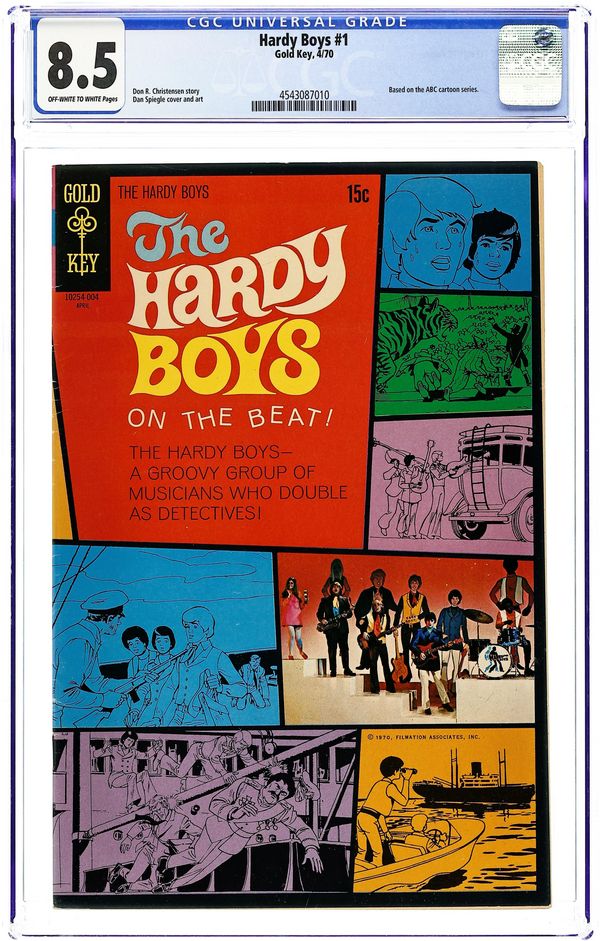 Starts Jan 3 First issue of comics based on the Saturday morning cartoon series which featured "The Hardy Boys," the famous teenage detectives, as a rock'n'roll band. The cartoon, made by Filmation, aired on ABC-TV from 1969 to 1971. This issue features the Hardy Boys in "Secret of the Orinda Star" and "The Dart-Riddle Rumble." Art by Dan Spiegle. Photo inset of the live Hardy Boys band on the front cover. # on cover 10254-004 April. #1 4/70 15c Cover price $0.15. Grade: CGC 8.5 explanation of grade Condition: Used (collectible)