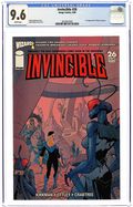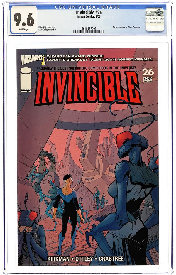 Ends Dec 8 8:38 PM CST Bid History 6 bids Current Bid $53 Your Secret Max Bid If you'd like to bid, please log in or register. August 17 ? 32 pg ? FC ? $2.95 written by ROBERT KIRKMAN art & cover by RYAN OTTLEY & BILL CRABTREE. "A DIFFERENT WORLD," Part Two?Mark is in a world completely alien to him. How did he get there? What is happening around him? And who is trying to kill him? Answers to these questions and more as the most climactic and earth-shattering story arc in INVINCIBLE history continues! Cover price $2.95. Grade: CGC 9.6 explanation of grade Condition: Used (collectible)