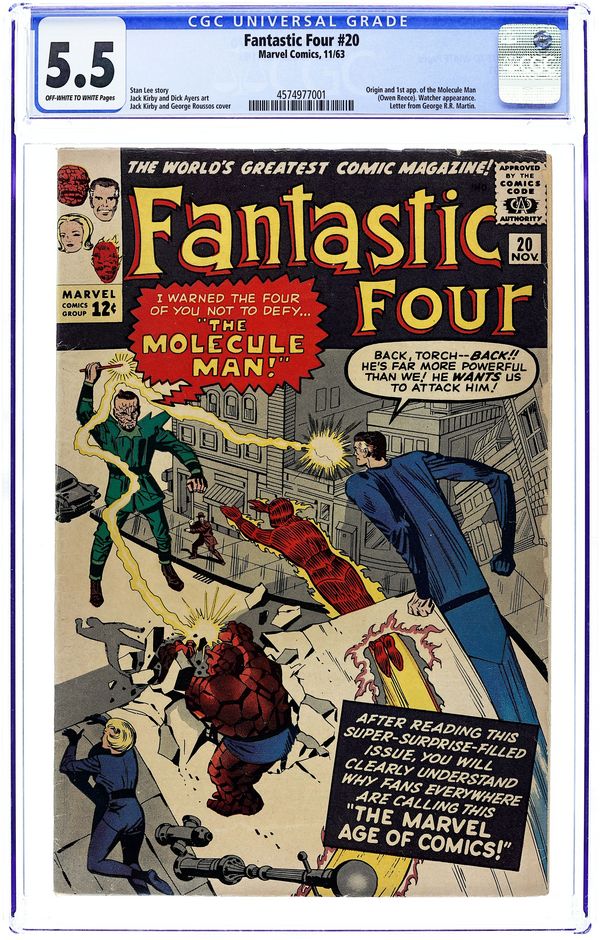 Starts Jan 3 Cover pencils by Jack Kirby, inks by George Roussos. Origin and first appearance of the Molecule Man in "The Mysterious Molecule Man!", script by Stan Lee, pencils by Jack Kirby, inks by Dick Ayers; The Watcher asks the Fantastic Four to stop a new menace who could destroy the whole universe: the Molecule Man. House ad for Tales To Astonish #49, art by Don Heck. The letters page contains a letter to the editor from George R. R. Martin, best known for the series 'A Song of Ice and Fire,' which HBO's 'A Game of Thrones' is based on (his first time published in print!), as well as a letter from then 10-year-old Mark Gruenwald, who identifies himself as the secretary of the Fantastic Four Fan Club (the Oshkosh contingent, anyway). Cover price $0.12. Grade: CGC 5.5 explanation of grade Condition: Used (collectible)
