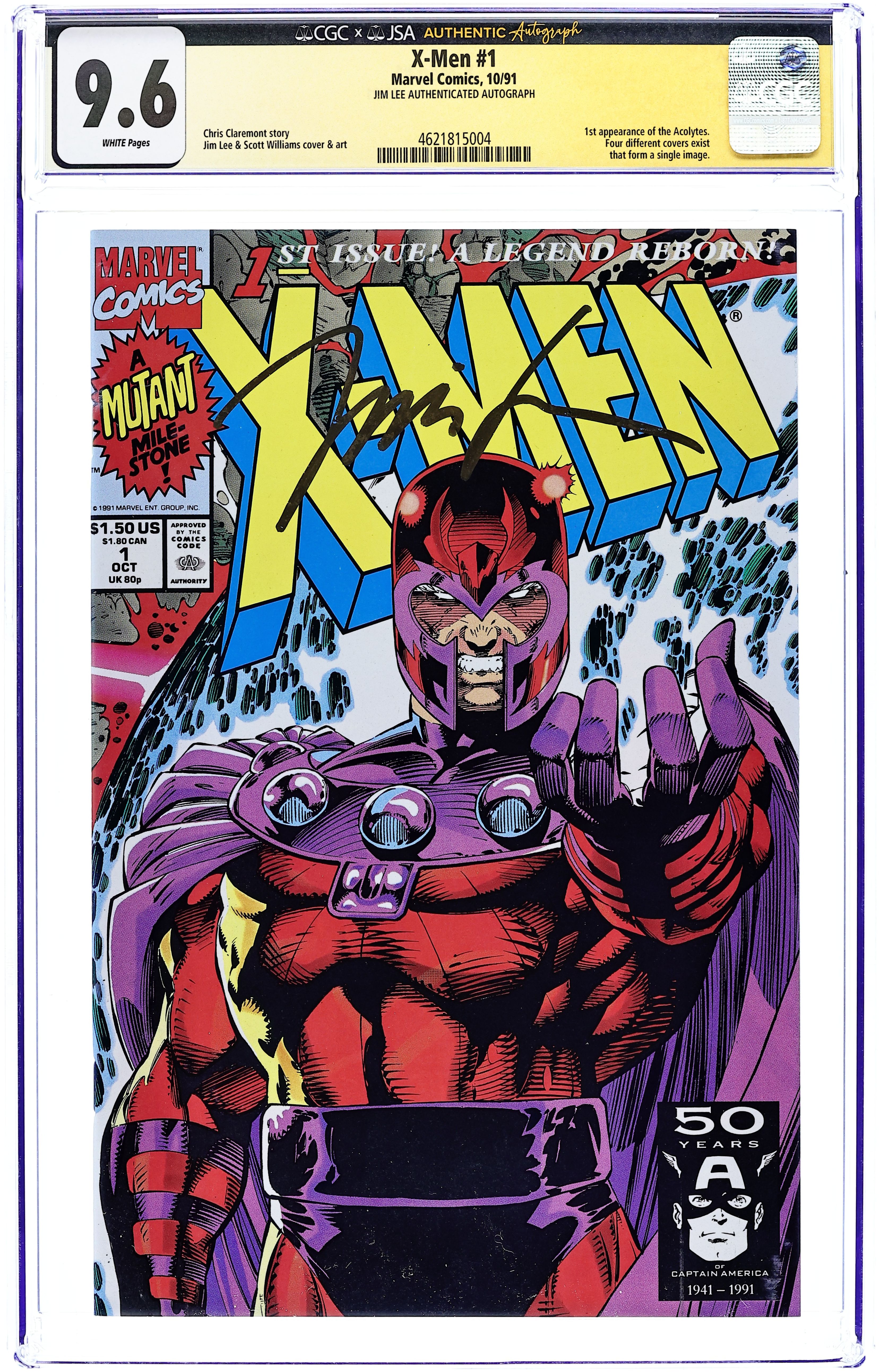Direct Edition. Magneto cover. Cover pencils by Jim Lee (signed), inks by Scott Williams. Rubicon, script by Jim Lee (Co-Plot) and Chris Claremont, pencils by Jim Lee, inks by Scott Williams; Magneto forms the Acolytes and proclaims Asteroid M a haven for mutants everywhere; But the rest of the world doesn't see it that way; Nick Fury cameo. 2-page pin-up: gallery of X-Men villains. X-Men Sketchbook by Jim Lee. Cover price $1.50. NOTE: Cover D connects to covers 1A, 1B, and 1C to form a single giant image. Cover price $1.50. Grade: CGC 9.6 explanation of grade Condition: Used (collectible)