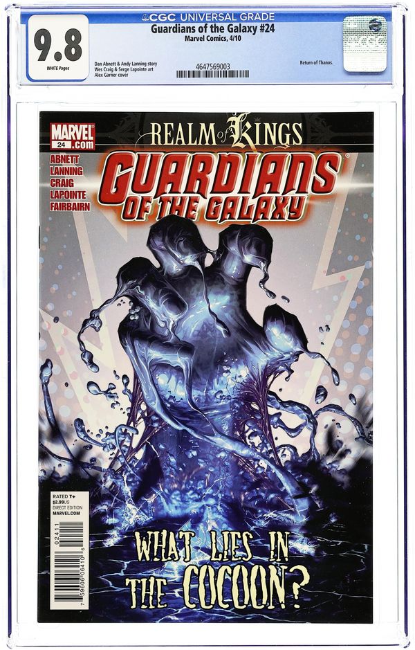 Realm of Kings Tie-in - Thanos Imperative Prologue: Part 1 of 2 - Written by DAN ABNETT and ANDY LANNING. Art by WES CRAIG. Cover by ALEX GARNER. The universe faces one of its greatest evils-and no one can see it coming! The Magus, the necromantic shadow-half of Adam Warlock, is not dead after all...and only a small and hapless band of heroes-heroes who should be dead, too-can stop him! Are they back from the grave permanently, and what will we finally see emerge from the enigmatic coccoon? Find out in the book that ComicsBullentin.com calls 'excellent...Abnett and Lanning combine cosmic adventure with gritty combat and a dash of comedy into a wonderful package.' Cover price $2.99. Grade: CGC 9.8 explanation of grade Condition: Used (collectible)