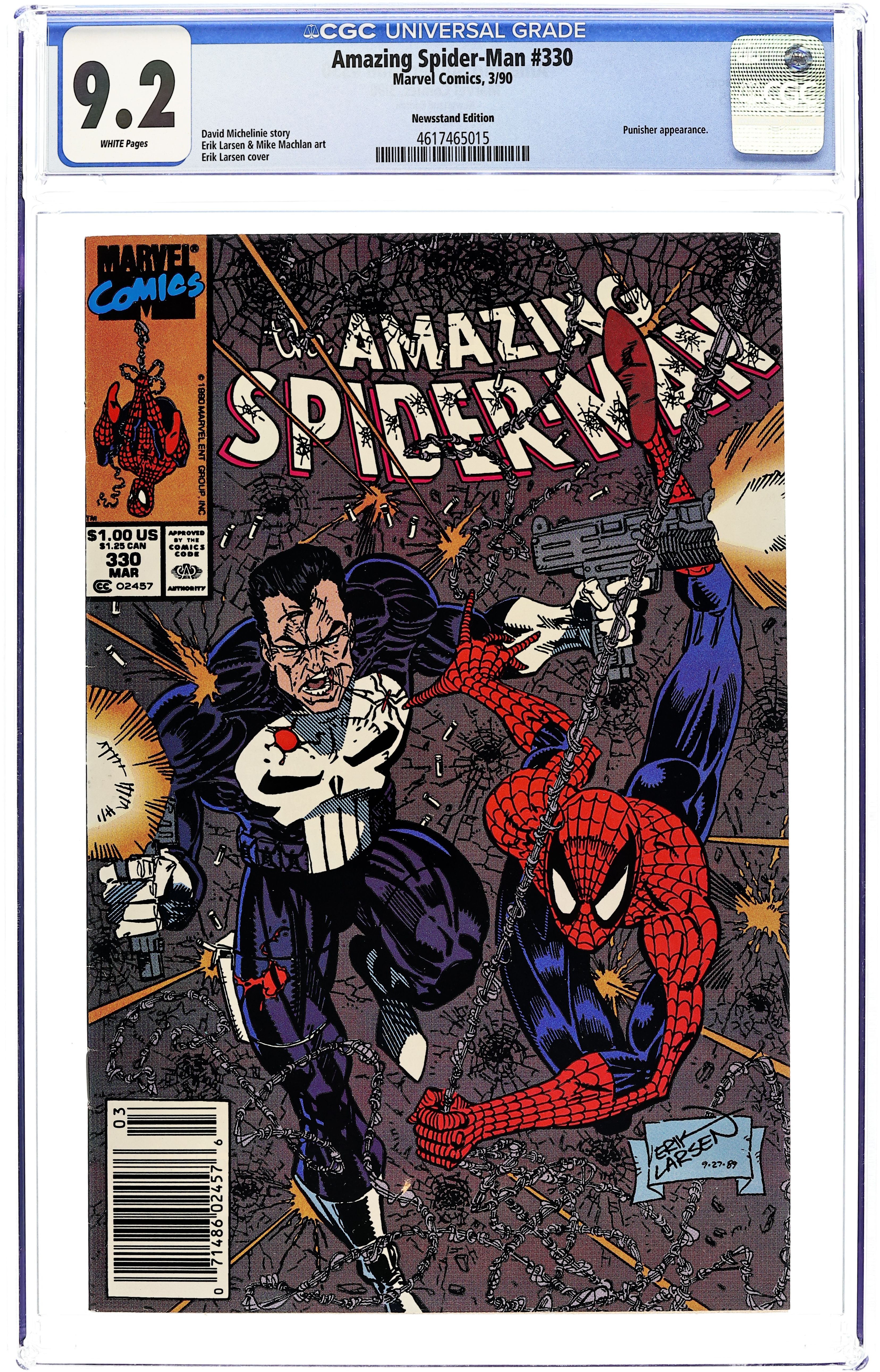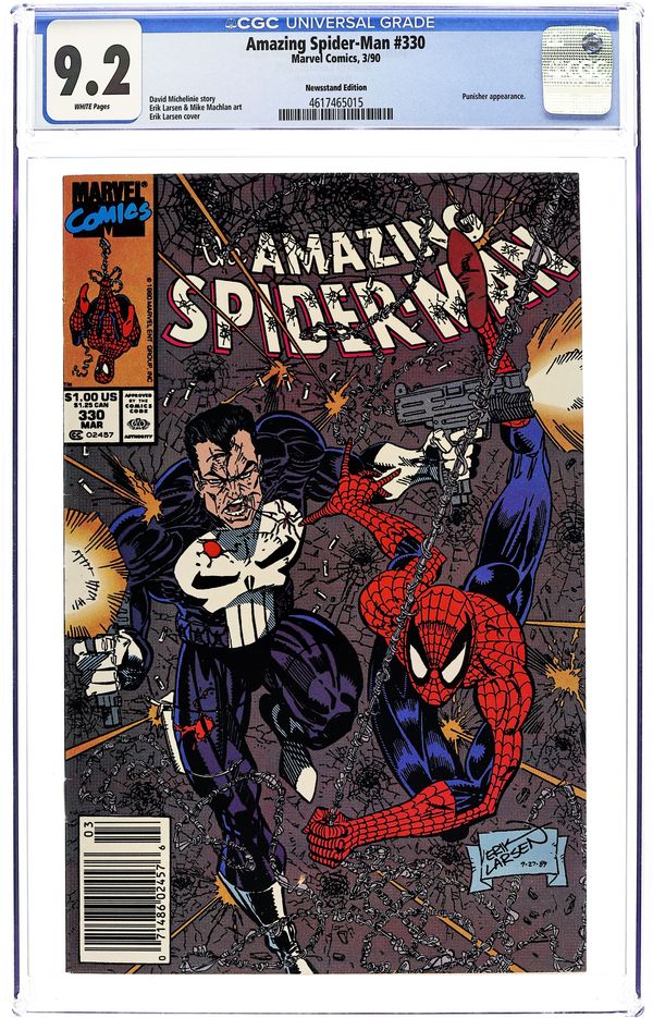 Ended Nov 24 7:15 PM CST Bid History 8 bids Winning Bid $19 First Printing. Newsstand Edition. "The Power Chase" Part 1 of 2. Guest-starring the Punisher. Script by David Michelinie. Pencils by Erik Larsen. Inks by Mike Machlan. Cover by Erik Larsen. The War on Drugs comes to the pages of the Amazing Spider-Man! As the web-slinger and the Punisher team up to track down a massive cocaine shipment coming into the Big Apple! On the Brooklyn docks, the wall-crawler and the gun-toting vigilante find what they're looking for in droves! The duo is not surprised that the coke is heavily guarded; however, they're shocked it's protected by the U.S. military! Are the feds dealing? Or perhaps better stated...double-dealing? Cameo appearances by Aunt May, Microchip, and Eddie Brock (aka Venom). Flashback cameos by Mary Jane Watson, Flash Thompson and the Black Cat. (Notes: There exists a JCPenney reprint of this issue (published in 1993) which can be identified by the words "The Amazing Spider-Man" in the UPC box on the front cover.) 36 pages Cover price $1.00. Grade: CGC 9.2 explanation of grade Condition: Used (collectible)
