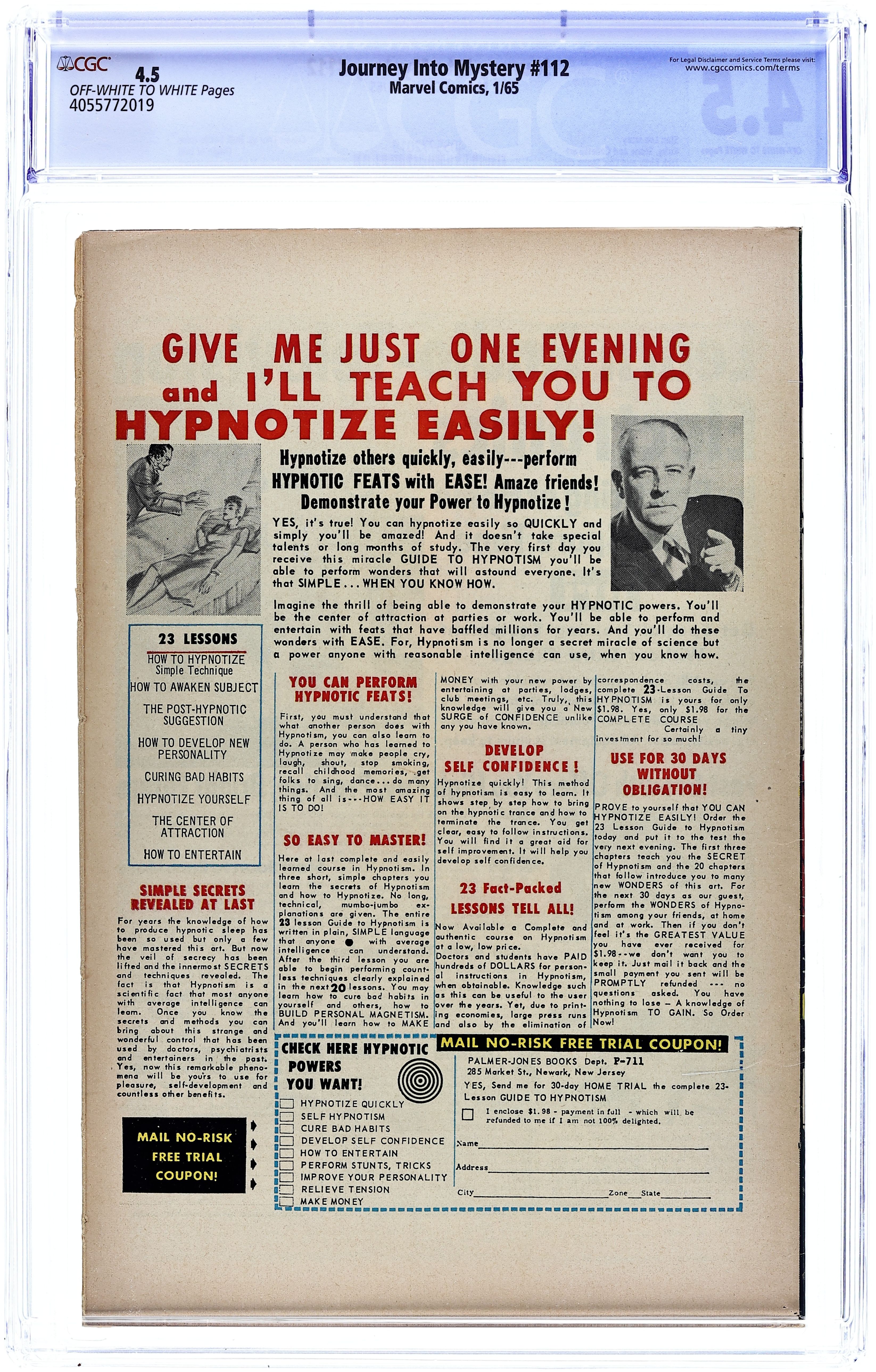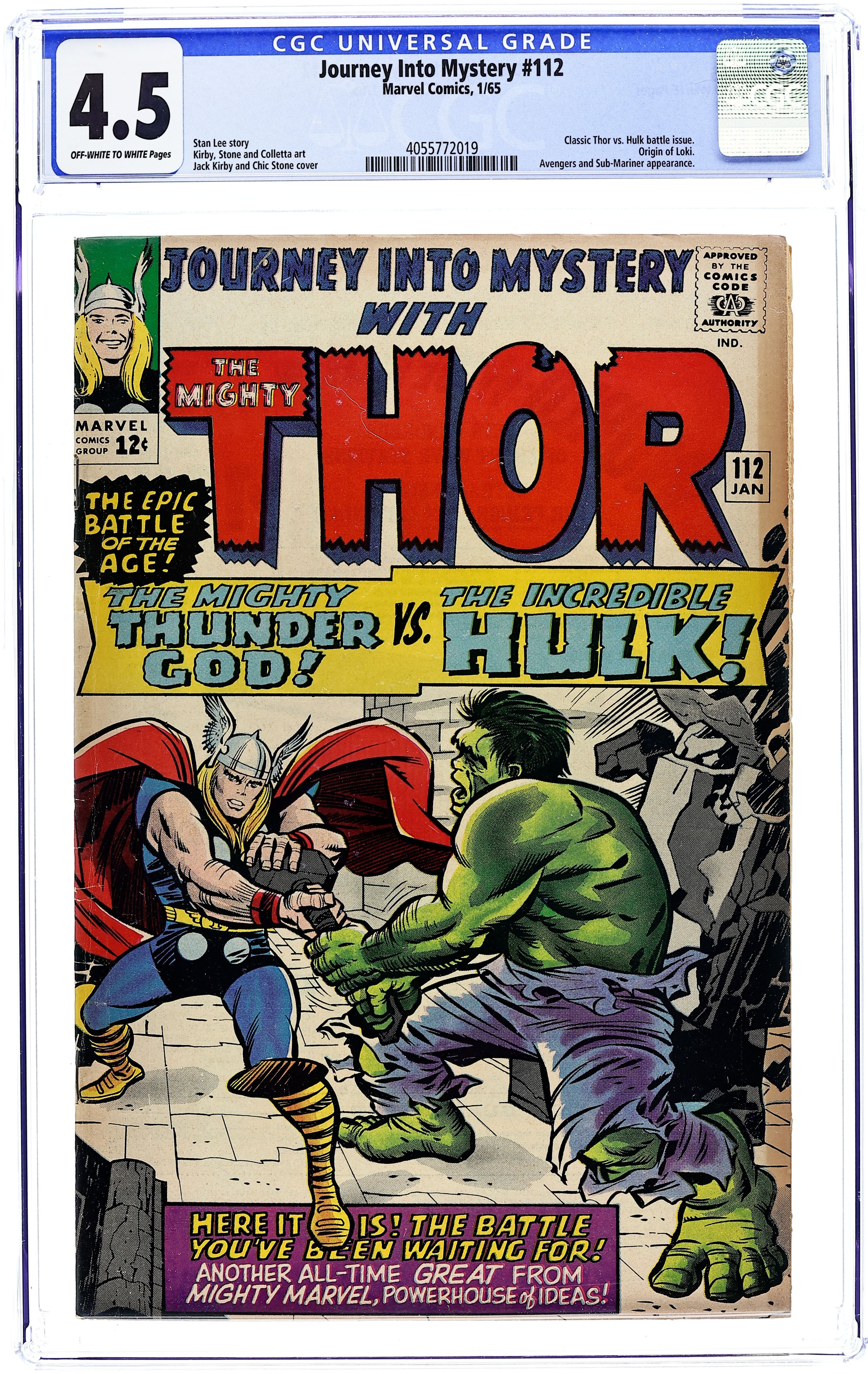 Cover pencils by Jack Kirby, inks by Chic Stone. "The Mighty Thor Battles the Incredible Hulk!", script by Stan Lee, pencils by Jack Kirby, inks by Chic Stone; Two rival fan clubs are debating who is stronger, Thor or the Hulk?; Thor happens to be passing by and drops in to offer his opinion; He relates the story of their epic battle (in Avengers #3) and describes a previously unseen scene in which he and the Hulk tussle; He goes into deep thought and when pressed, cannot say who is the stronger because he has insufficient proof!; Guest appearances by the Avengers (Iron Man, the Sub-Mariner, Giant-Man, and the Wasp) and Odin. "Tales of Asgard" back-up: "The Coming of Loki!", script by Stan Lee, pencils by Jack Kirby, inks by Vince Colletta; The Asgardians battle the Giants. Laufey, King of the Giants of Jotenheim, is slain; A bundle of cloth is found. It contains a baby; Odin adopts the child and names him Loki. The Merry Marvel Marching Society promo. 36 pgs., full color. Cover price $0.12. Grade: CGC 4.5 explanation of grade Condition: Used (collectible)