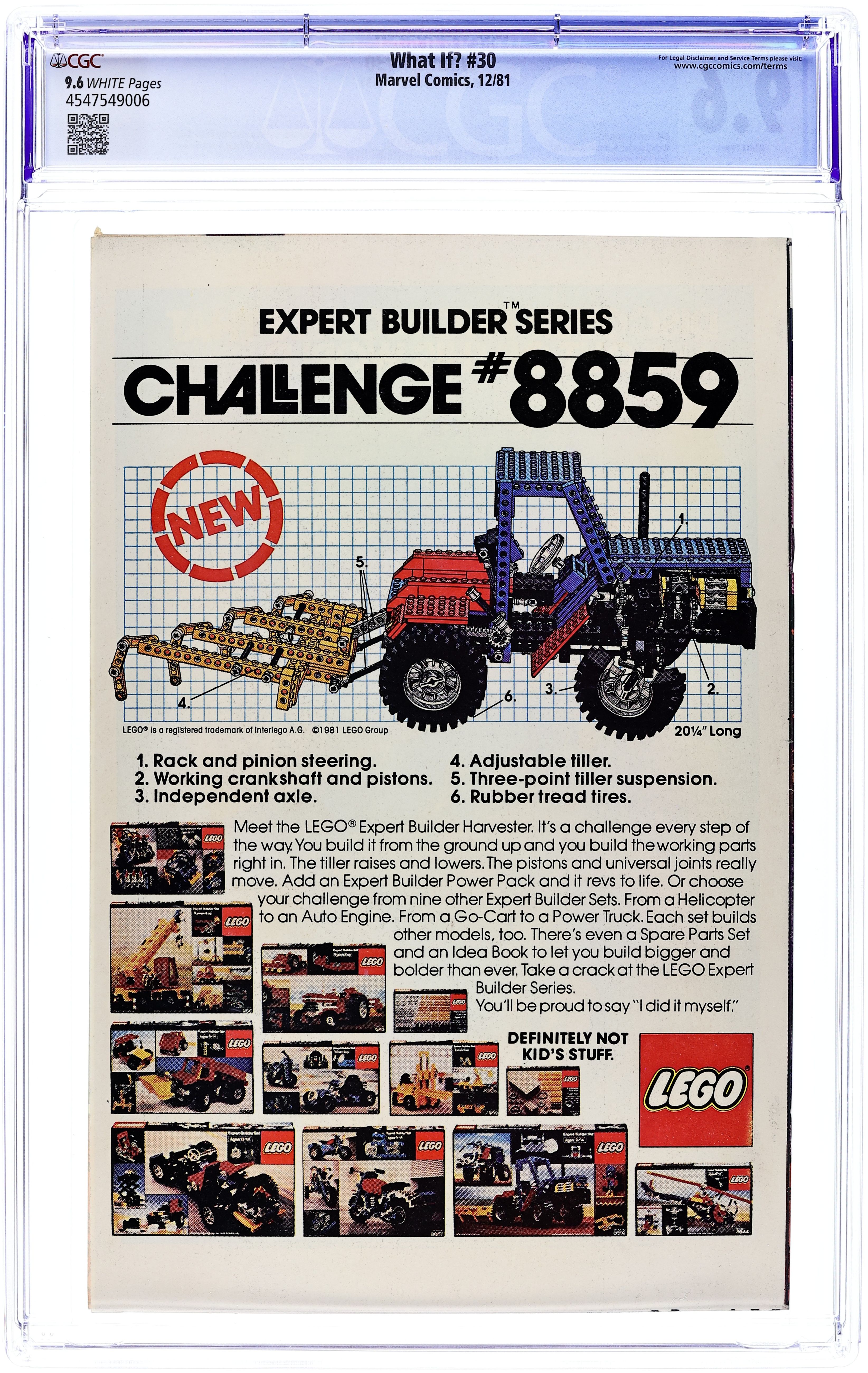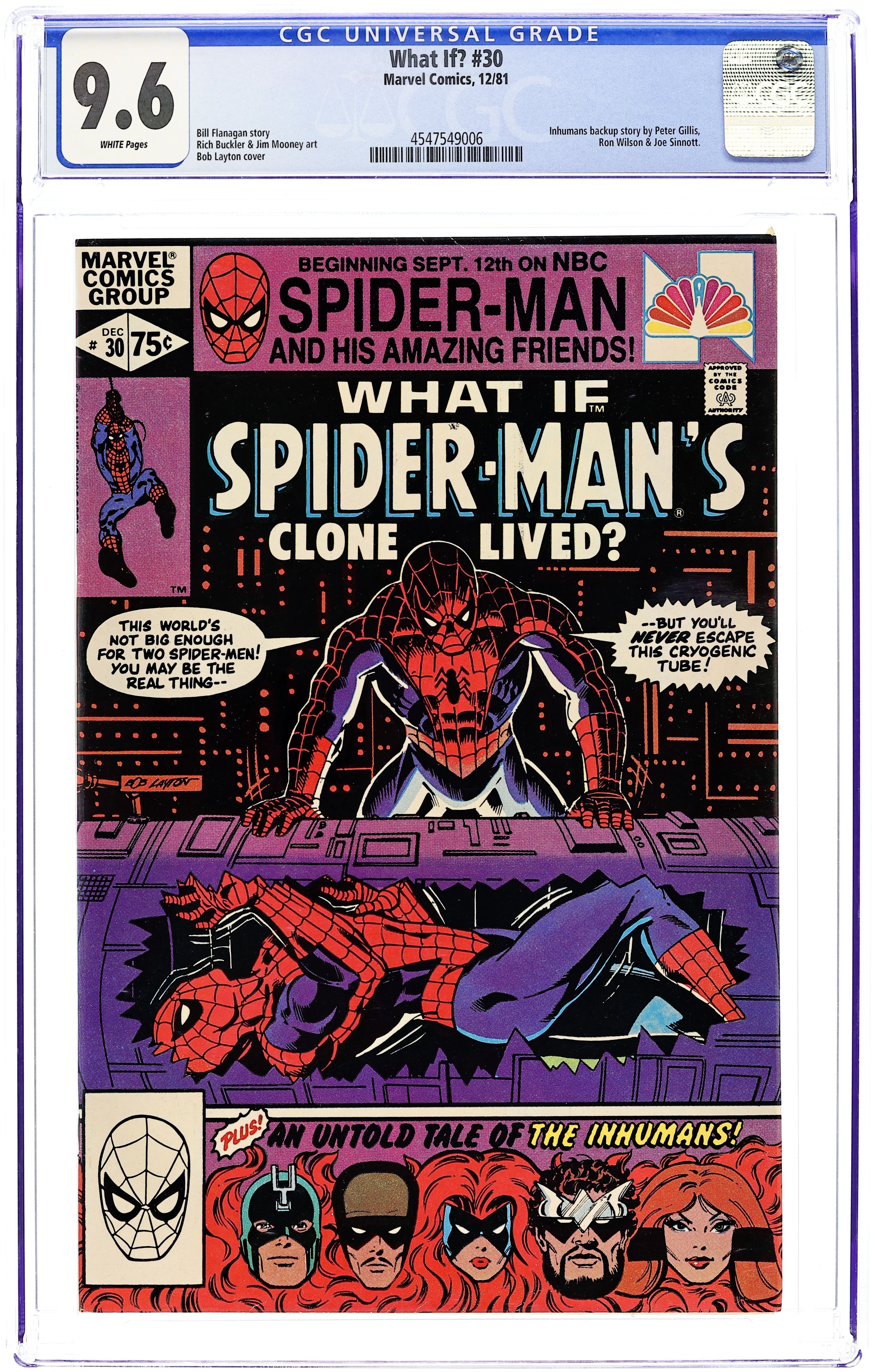 "What If...Spider-Man's Clone had Survived?" Script by Bill Flanagan. Art by Rich Buckler (breakdowns), Jim Mooney (finishes), and Pablo Marcos (finishes). Cover by Bob Layton. In the classic Amazing Spider-Man 149, the Spider-Clone perished in battle vs. the Jackal. But now the Watcher presents an alternate reality in which Spider-Man's clone survives the harrowing encounter at Shea Stadium that fateful afternoon. After the explosion that killed the Jackal, the Spider-Clone frees Ned Leeds, scoops up the other web-slinger, and asks the Gwen Stacy clone to call the police! The Spider-Clone takes the real Spider-Man back to Professor Warren's laboratory for safekeeping! In the days ahead, the clone attempts to resume Peter Parker's normal life, but his awkward encounters with Joe Robertson, Betty Brant, and Glory Grant make him realize that something is terribly wrong! Once the clone comes to grips with his true self, he frees the genuine wall-crawler! And together Spider-Man and the Spider-Clone fight and defeat the Kingpin! It looks like the start of a beautiful friendship! Flashback cameos by Gwen Stacy and the Green Goblin. Backup story: "Moving Day!" Script by Peter Gillis. Art by Ron Wilson (breakdowns) and Joe Sinnott (finishes). In this untold tale of the Marvel Universe, the Inhumans pack up and move the Great Refuge to the Himalayan Mountains! Appearances by Black Bolt, Medusa, Karnak, Gorgon, Crystal, and the Eternals. (Notes: The original clone saga took place in Amazing Spider-Man 141-151. Many years later this What If story became reality in the mainstream Marvel Universe via the controversial second clone saga that ran through the Spider-Man titles from 1994 to 1996. Both stories were reprinted in 2008 in the trade paperback: What If? Classic 5.) 52 pages. Cover price $0.75. Grade: CGC 9.6 explanation of grade Condition: Used (collectible)