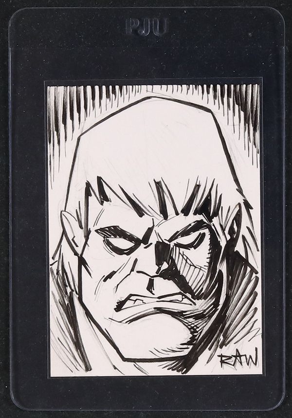 DC's rhyming zombie looks as imposing as ever in this great sketch. Signed by the artist. Pencil and ink on art board. 2 1/2" x 3 1/2".