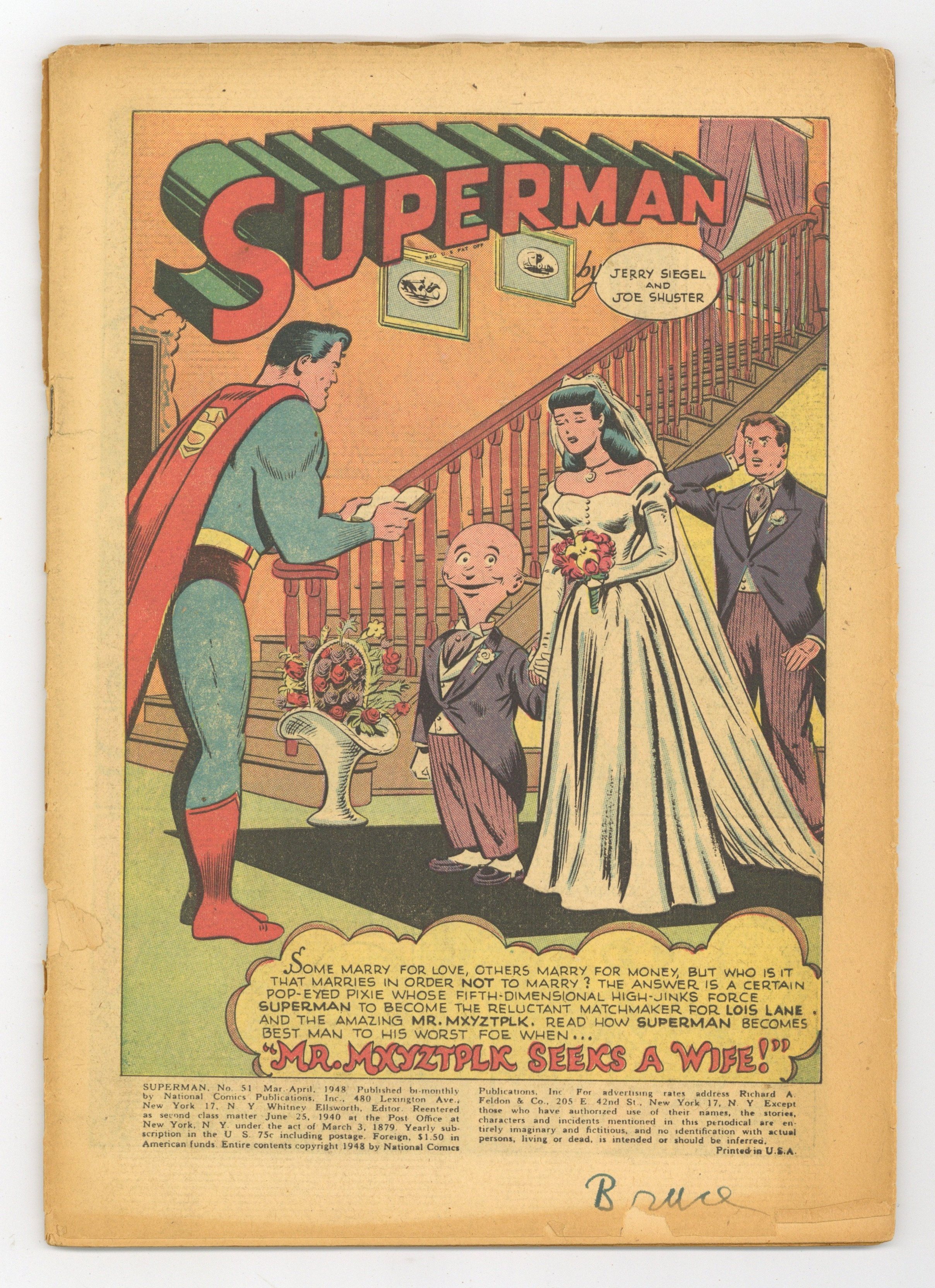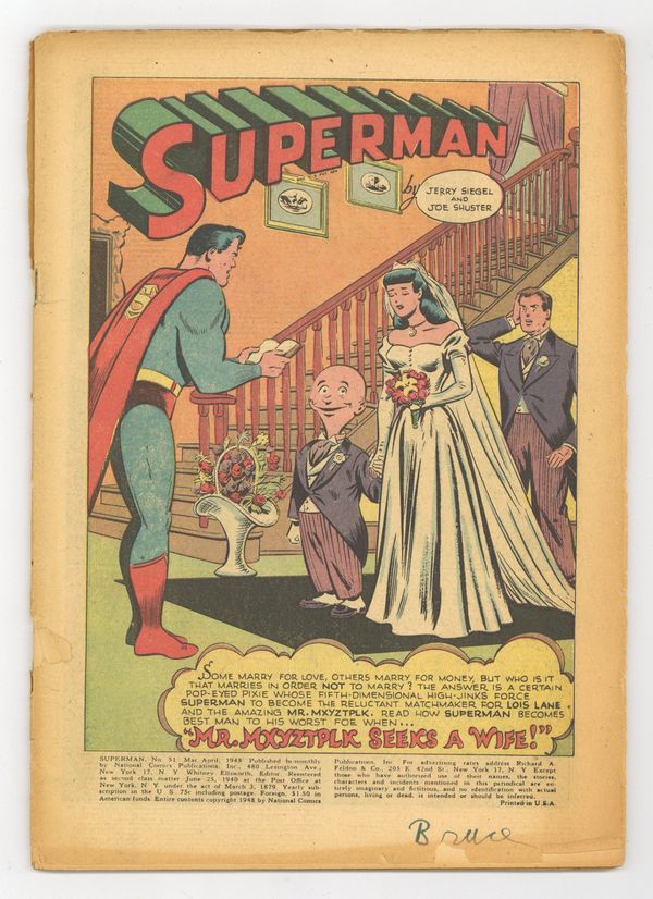Cover pencils by Wayne Boring, inks by Stan Kaye. Mr. Mxyztplk Seeks a Wife, script by Alvin Schwartz, art by Win Mortimer; Mxyztplk tries to get Lois Lane to marry him so he won't have to marry the king's daughter. The Magnetic Mobster starring Superman, Mr. Ohm, Lois Lane, and Perry White, script by Alvin Schwartz, art by Win Mortimer. Book Learning text story by Cliff Rhodes. The Man Who Bossed Superman, pencils by Curt Swan. 52 Pages, Full Color. Cover price $0.10. Grade: Coverless explanation of grade Condition: Used (collectible)