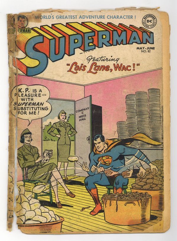Cover art by Win Mortimer. Lois Lane Joins the WACs! starring Superman, Lois Lane, Sgt. Gloria Mulvaney, Perry White, and Judy Masters, script by Bill Woolfolk, pencils by Wayne Boring, inks by Stan Kaye. Jerry Jitterbug humor two-pager by Henry Boltinoff. The Unemployed Superman starring Superman, Mr. Mxyztplk, Lois Lane, and Perry White, art by Al Plastino. The Hurricane Hunters text article by John Marlowe. The Super-Reporter of Metropolis starring Superman, script by Bill Woolfolk, art by Al Plastino; Superman single-handedly puts out an issue of the Dailey Planet. 44 Pages, Full Color. Cover price $0.10. Grade: PR 0.5 explanation of grade Condition: Used (collectible)