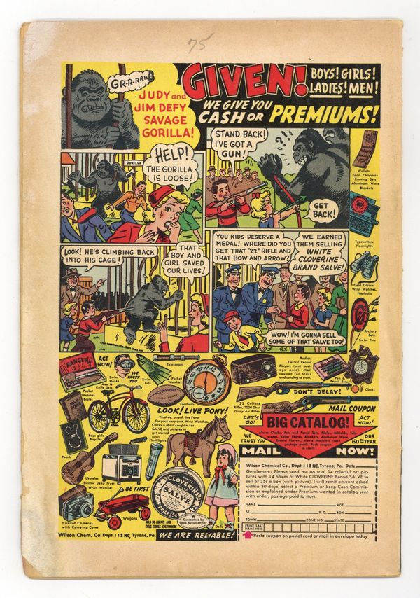 Cover art by Al Plastino. The Amazing Professor Memory, script by Bill Finger, art by Al Plastino; Superman takes the place of Professor Memory when the mob is after him for accidentally learning the serial numbers on some stolen bills. Varsity Vic humor page by Henry Boltinoff. The Big Game Hunt of Metropolis, script by Otto Binder, pencils by Curt Swan, inks by Ray Burnley; The Swindle Syndicate dupe Jimmy Olsen with free passes to Jack Borden's Big Game Hunt in an attempt to stop Clark Kent from figuring out who their leader is. Superboy's Last Day in Smallville!, script by Jerry Coleman, pencils by Wayne Boring, inks by Stan Kaye. Fearless Fosdick stars in a quarter-page Wildroot Cream-Oil ad with art by Al Capp. 36 Pages, Full Color. Cover price $0.10. Grade: FR/GD 1.5 explanation of grade Condition: Used (collectible)