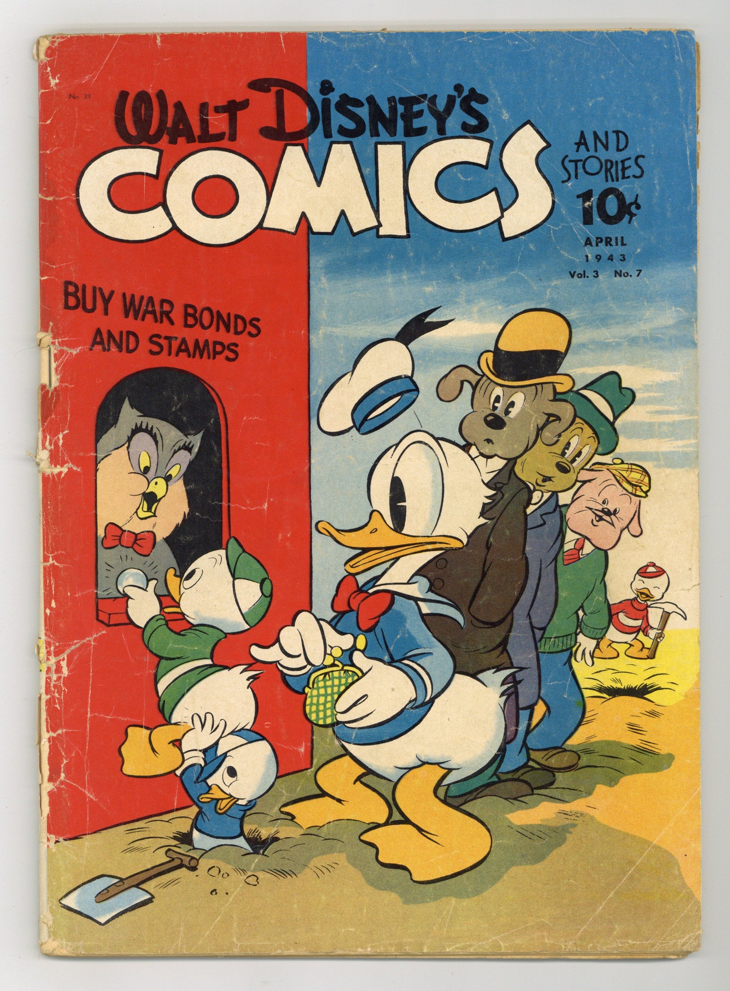 Cover by Walt Kelly. Stories and art by Carl Barks, Floyd Gottfredson, Ted Thwaites, Merrill De Maris, Hubie Karp, Bob Wright, Bob Grant, Karl Karpé, Ken Hultgren and Al Taliaferro. Sometimes listed as Vol. 3 #7. The long-running vehicle for Disney character comics featured early work by Carl Barks, the legendary Good Duck Artist. In a classic Floyd Gottfredson story from the Mickey Mouse comic strip, Mickey becomes the hotel detective in the haunted hotel. Donald tries to keep his victory garden safe from crows, in the first Donald Duck story written, drawn, and lettered by Carl Barks. Donald thinks his chimney is on fire. Where There's Smoke; Gratitude; Juggler; Sammy Seal Earns His Name; Friend Owl; The Medicine Man; Helping Red Cross; Modern Meal; Bolivar Behaves; Free Admission; Mickey Mouse, Bellhop Detective; Hollywood Chatter; The Loser; Strategy; Mousetrap; Oooh!; Wigwam; Proof!; Reserved Seat; Out Or In?; Birds of a Feather; Reply by Direct Wire; Victory Vehicles; They're Off; There's Always A Way; Doing It Up Right; Think Nothing of It, Daisy; An Idle Threat; A Hole in One; It's a System; That'll Make 'em Say Uncle!; Anybody Got a Bellows?; There's No Justice. 64 pages, Full Color. Cover price $0.10. Grade: FR 1.0 explanation of grade Condition: Used (collectible)