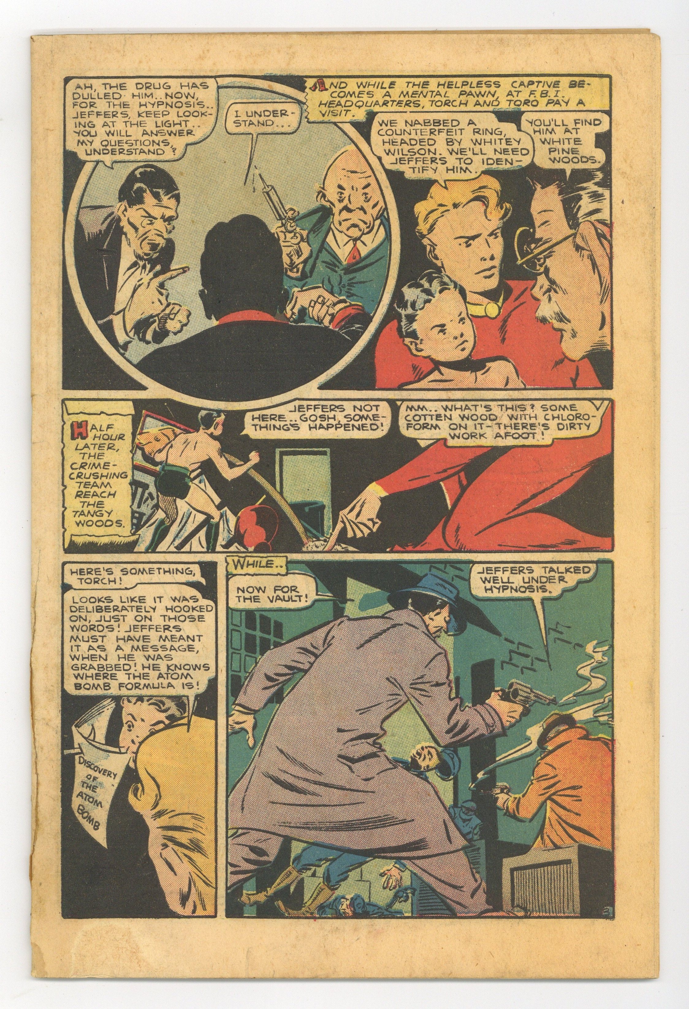 Cover art by Vince Alascia. Conquest of Death starring Human Torch. Pawns of Destiny starring Sub-Mariner, pencils by Allen Simon. Cyclops starring Miss America, script by Otto Binder, art by Charles Nicholas. Junkyard Jalopy text story. A Farewell to Larceny starring Patriot, pencils by Al Bellman, inks by Bob Oksner. The Adventure at the White Rabbit Inn starring Angle, art by Carmine Infantino. 52 pages. Cover price $0.10. Grade: Coverless explanation of grade Condition: Used (collectible)
