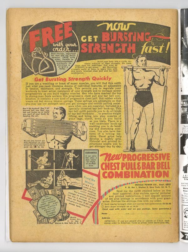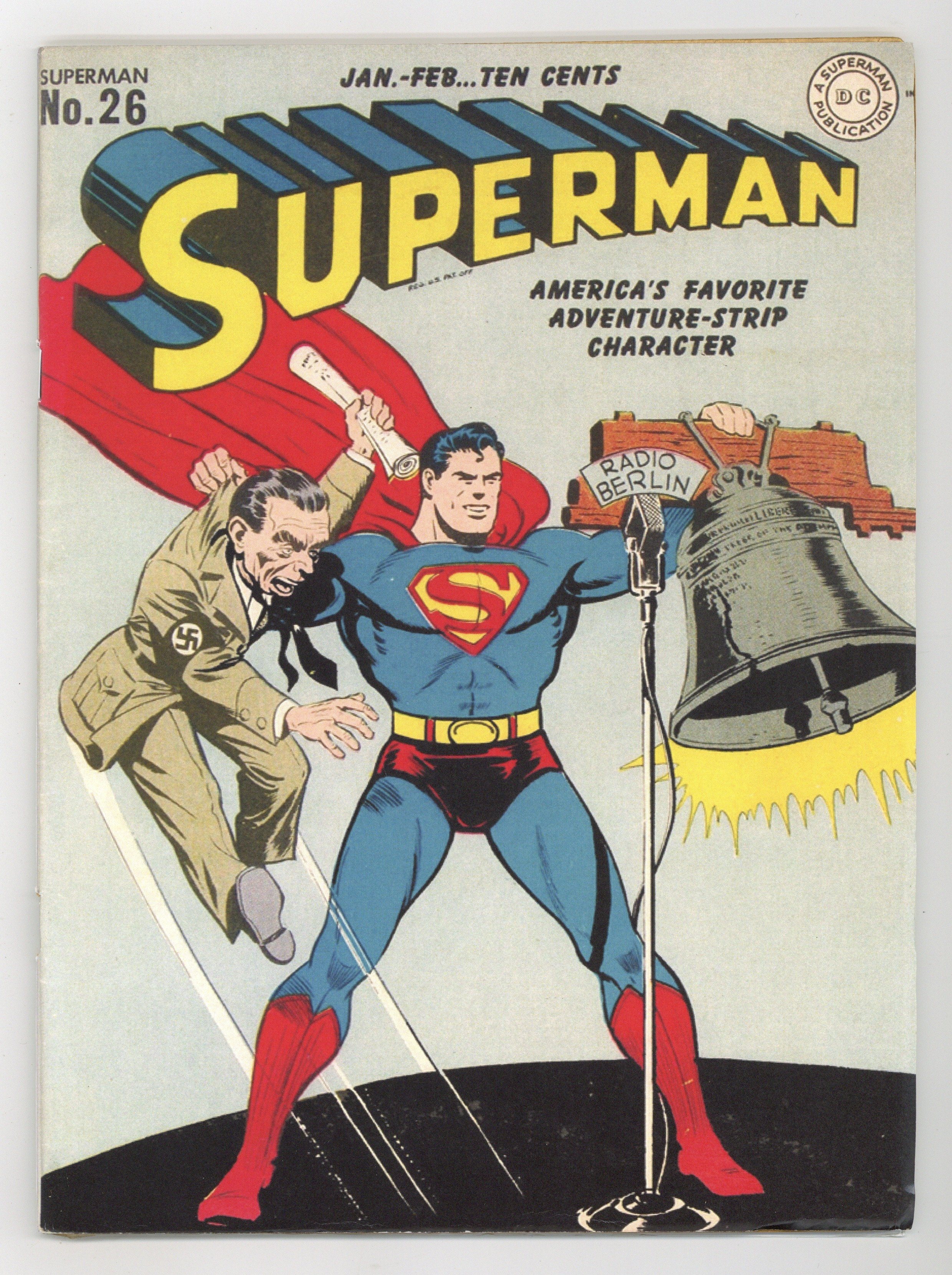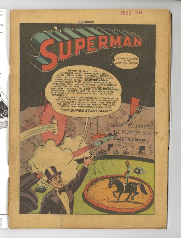 Classic war cover. Cover pencils by Wayne Boring, inks by George Roussos. The Super Stunt-Man!, script by Bill Finger [as Jerry Siegel], pencils by Joe Shuster and Ira Yarbrough [as Joe Shuster]; The son of a former carnival daredevil comes to town, not knowing his father had lost his nerve years before in a car stunt gone wrong. Comedians' Holiday!, script by Don Cameron [as Jerry Siegel], art by Ira Yarbrough [as Joe Shuster]; Clark and Lois decry the closing of a new movie company that has given work to former vaudeville comedians. Private Pete humor page by Henry Boltinoff. Superman's Master!, script by Jerry Siegel, pencils by Ira Yarbrough [as Joe Shuster]. The March text story by Alton Black. Good Ol Judge Jalopy humor page by Jack Farr. The Quicksilver Kid! starring Superman, script by Don Cameron [as Jerry Siegel], pencils by Dick Sprang (layouts) and San Citron (finishes) [as Joe Shuster]. 60 Pages, Full Color. Cover price $0.10. Grade: Coverless explanation of grade Condition: Used (collectible)
