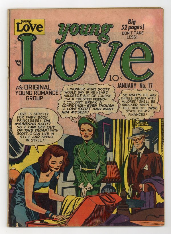 Cover by Jack Kirby. Art by John Severin, Mort Meskin, Joe Simon and Jack Kirby. Part of Prize's influential romance comics line, produced by the studio of Captain America creators Joe Simon and Jack Kirby. Issue #17 on cover; Vol. 2, issue #11 in indicia. Mildred hopes Scott's money will get her out of poverty, but he's got a couple of surprises for her. Janie fakes a fiancee to impress her friends, but scares off the man who actually loves her. Bitter redhead Della doesn't trust any man - even the one she should. The Quiet One; I Saw Him First; Will You Help Me?; The Blind Date; Go Home and Grow Up; Personality Plus; I Promised Never To Marry; She Loves Too Wisely. 48 pages, Full Color. Cover price $0.10. Grade: GD/VG 3.0 explanation of grade Condition: Used (collectible)