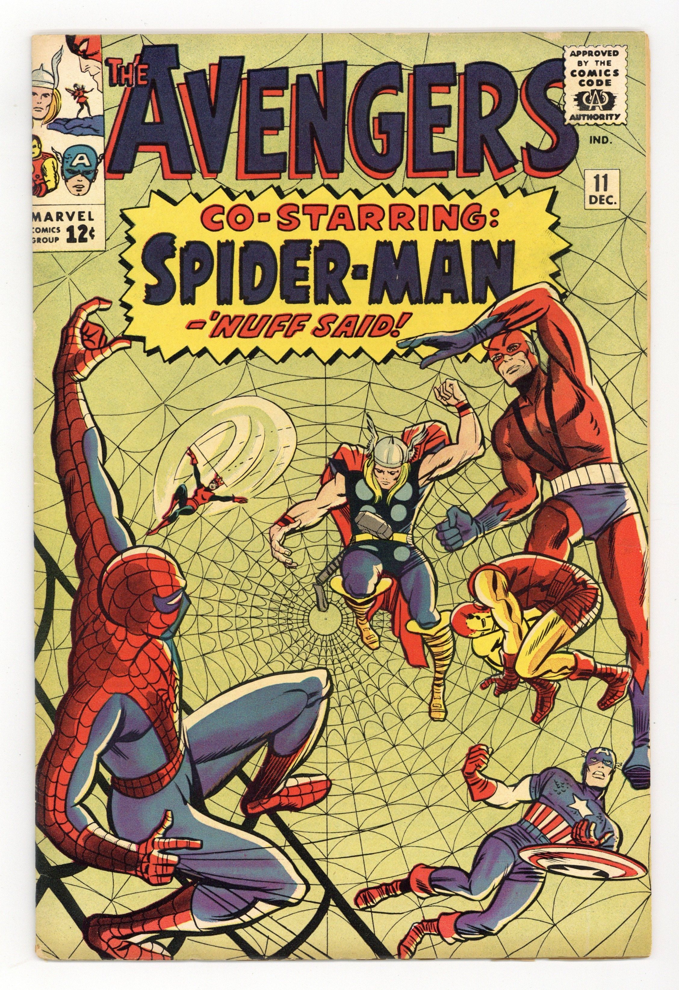Cover pencils by Jack Kirby, inks by Chic Stone. The Mighty Avengers Meet Spider-Man, script by Stan Lee, pencils by Don Heck, inks by Chic Stone; Kang creates a robotic Spider-Man and sends him back in time to battle the Avengers. Roster: Captain America, Thor, Giant-Man, Wasp, and Rick Jones. Guest stars the Amazing Spider-Man. Villain: Kang. Cameo appearances by Zemo, the Executioner, Wonder Man, Dr. Doom, Magneto, Mysterio, the Unicorn, and Kraven the Hunter (all in Kang's files). Kang pin-up. 36 pgs. $0.12. Cover price $0.12. Grade: VG 4.0 explanation of grade Condition: Used (collectible)