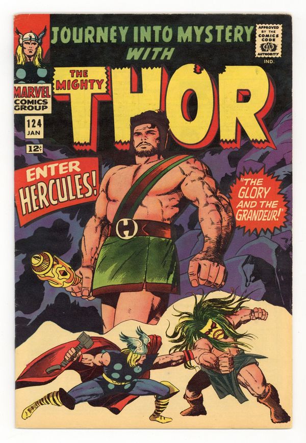 Cover pencils by Jack Kirby, inks by Vince Colletta. First appearance of Atlas in "The Grandeur and the Glory!", script by Stan Lee, pencils by Jack Kirby, inks by Vince Colletta; Thor learns of a "demon" terrorizing the jungles of Asia; Donald Blake reveals his secret to Jane, infuriating Odin; And, Zeus dispatches Hercules to Earth to deal with the native turned "Demon." Tale of Asgard: "Closer Comes the Swarm!", script by Stan Lee, pencils by Jack Kirby, inks by Vince Colletta; While the Asgardians are licking their wounds after a battle with a dragon, Queen Ula sends out the Flying Trolls of Thryheim to finish them off. Appearances by Balder, Hogun, Fandral, and Volstagg. 36 pgs., full color. $0.12. Cover price $0.12. Grade: VG 4.0 explanation of grade Condition: Used (collectible)