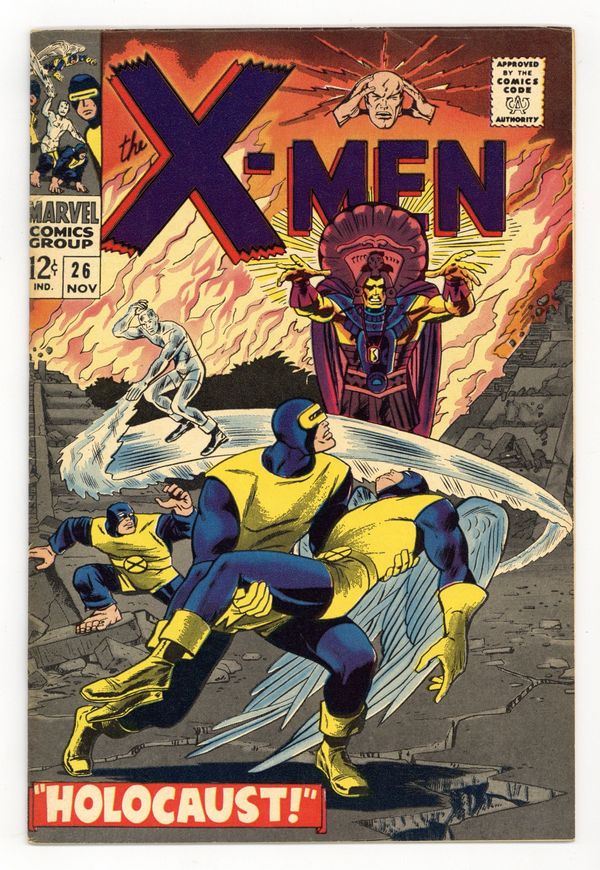 Cover pencils by Werner Roth and Jack Kirby (Kulkulkan assist), inks by Dick Ayers. Holocaust!, script by Roy Thomas, pencils by Werner Roth, inks by Dick Ayers; the X-Men (sans Marvel Girl) battle Kukulcan; Cyclops accidentally hits Angel with an optic blast. 36 pgs. $0.12. Cover price $0.12. Grade: FN 6.0 explanation of grade Condition: Used (collectible)