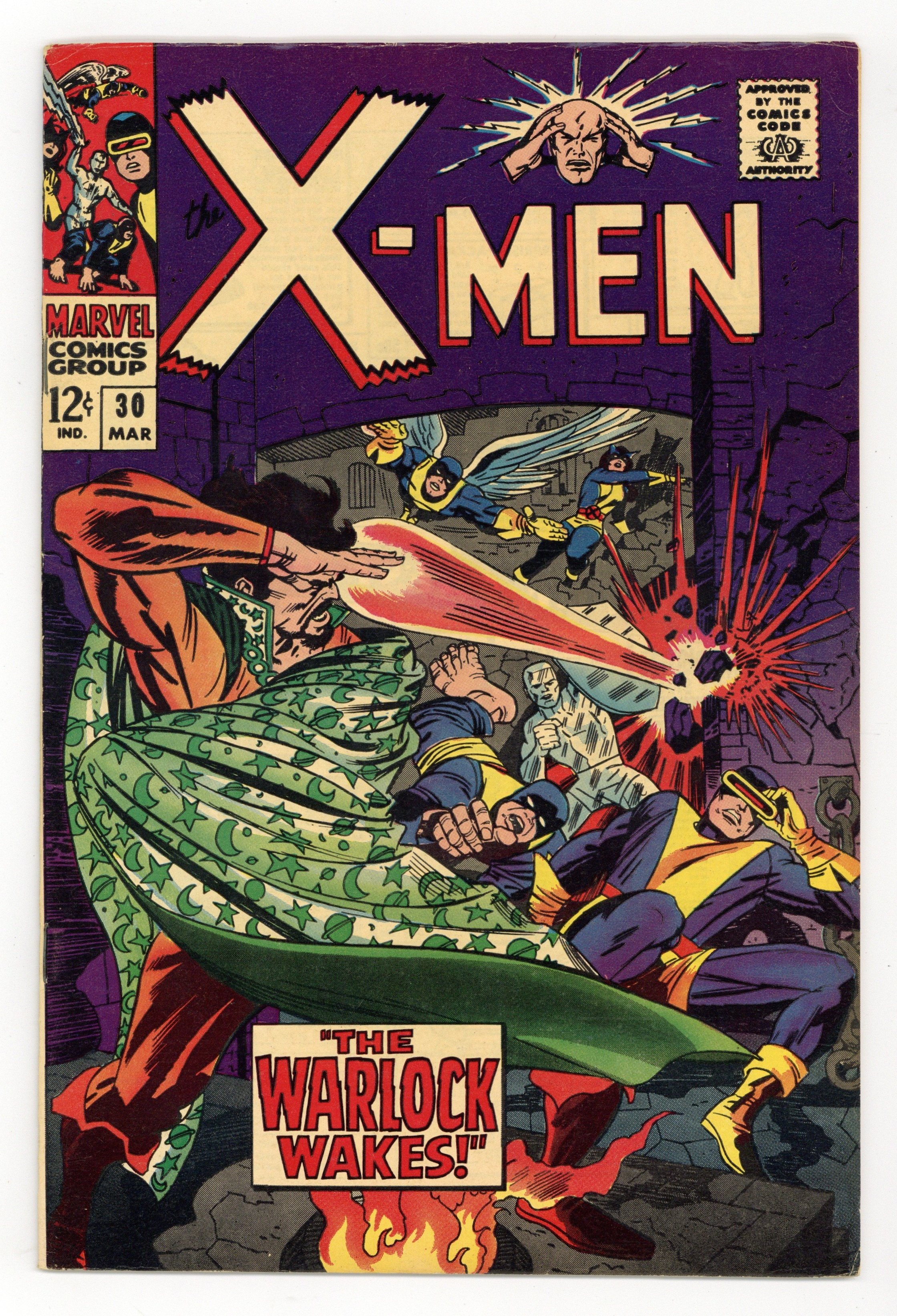 Cover pencils by Jack Kirby. The Warlock Wakes!, script by Roy Thomas, pencils by Jack Sparling, inks by John Tartaglione; the X-Men battle Warlock, who reveals that he used to be Merlin the Magician;Thor cameo. This issue contains a statement of ownership--average print run 412,086; average paid circulation 255,070.36 pgs. $0.12. Cover price $0.12. Grade: FN+ 6.5 explanation of grade Condition: Used (collectible)