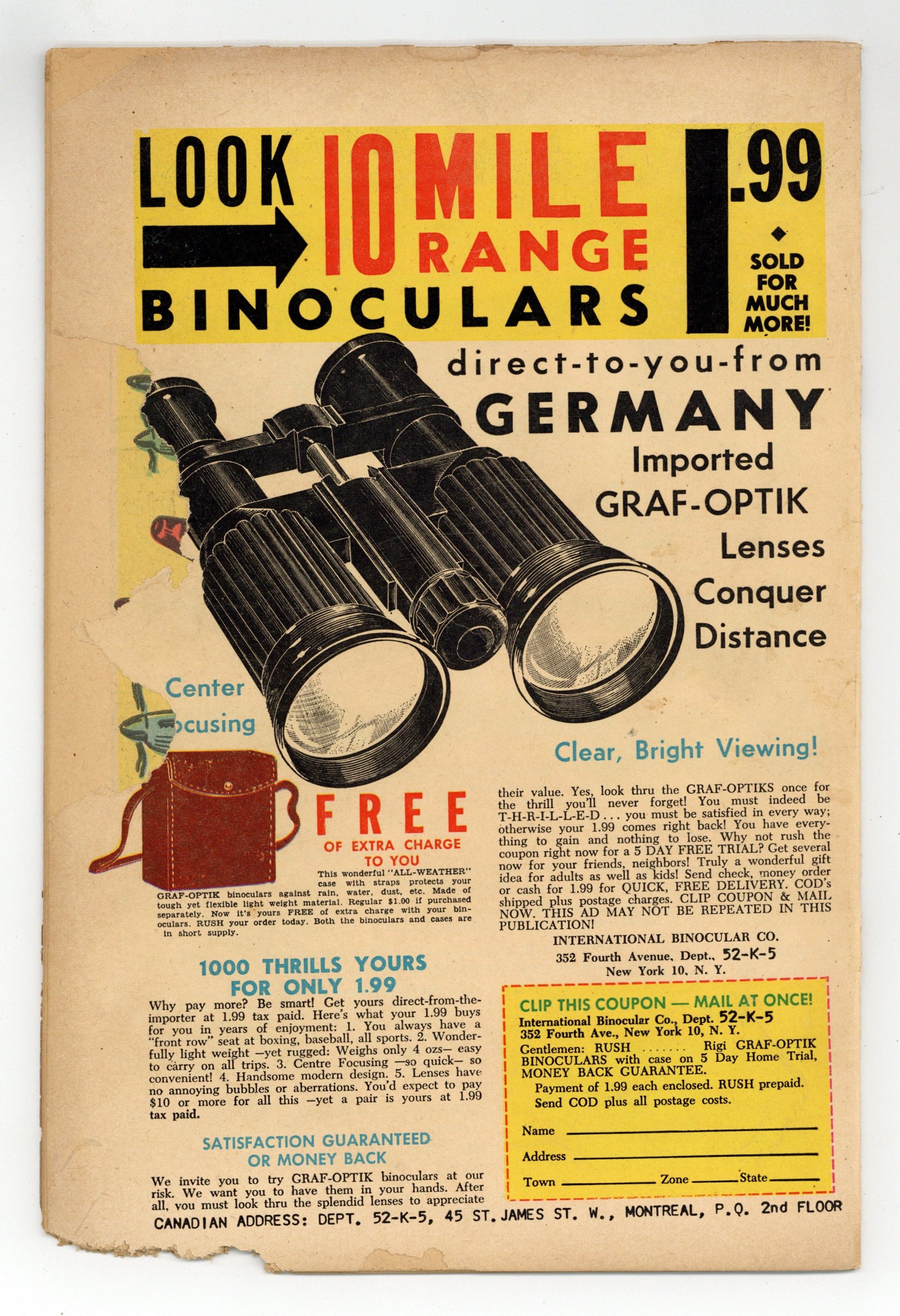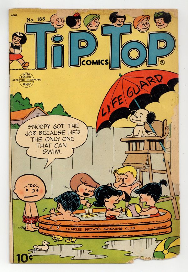 Cover by Charles Schulz. Stories and art by Charles Schulz, Ernie Bushmiller, Rudolph Dirks, Mik, Dick Van Buren, and Bob Lubbers. Tip Top Comics presented color reprints of United Features newspaper comic strips. One of the backup strips in the comic is Charles Schulz's Peanuts, then only in its fifth year; several strips are presented in full color. Lucy's bouncing of the ball 50,000 times finally drives Charlie Brown over the edge. Snoopy feels left out by the gang, in one of his earliest interior monologues. Nancy has too much junk food while visiting the zoo. Tarzan finds himself in the strange land of Luanda. One of the earliest appearances of Schulz's Peanuts on the cover of a comic book. Nancy; Peanuts; Strange as It Seems; Hobbies for All!; The Captain and the Kids; Stamp Tips; Ferd'nand; Tarzan. Final issue published by United Features; St. John takes over publishing with the next issue. 32 pages, Full Color. Cover price $0.10. Grade: FR 1.0 explanation of grade Condition: Used (collectible)